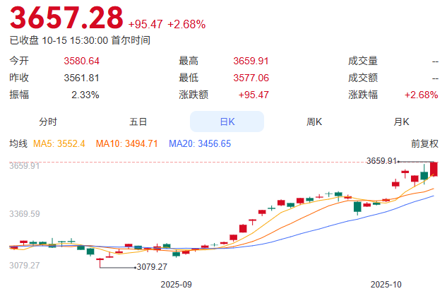 韩国股市近日表现引人瞩目。 当地时间10月15日,KOSPI指数报收3657.28点,较前一交易日上升95.47点,涨幅2.68%,续创历史新 高。 摩根士丹利在最新研报中称,尽管贸易紧张局势加剧可能带来短期波动,但结构性增长驱动因素将限制 下行风险并推动韩股进一步上涨。 该行韩国策略团队主管Joon Seok等分析师认为,AI发展、国防、电力基础设施和韩流文化四大超级周 期正与政府改革议程形成共振,为韩国股市提供下行保护和上行动力。 今年以来,韩国股市的强劲表现也源于李在明政府上任后推行的一系列改革政策。 李在明在竞选中提出的"KOSPI5000点"目标被市场视为革命性宣言,其上任后推出的公司治理改革、刺 激消费和投资AI三大政策迅速提振了市场信心。 公司治理改革政策尤其引人注目,包括修订商法强制注销库存股、对高股息企业减税、强化董事受托责 任,直指财阀"低分红、低回购"顽疾。高盛测算,若改革落地,KOSPI市盈率有望从9.3倍修复至12 倍。 摩根士丹利预计,下一步改革措施将涉及库存股规则和关键税收改革。股息税改革方面,基本情况假设 最高税率将设定在30%以下,低于政府提议的35%,并在2025年确认。库 ...