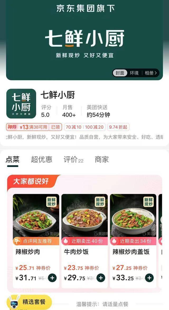刘强东表示,民营企业要简单实在点见面聊聊,所有企业该竞争竞争,靠战略、靠商业模式、靠价值创造和信誉最终赢得消费者。"我们不应该变成仇人, 不要把正常的商业竞争变成个人恩怨,没有必要。兴哥我很尊重,莆中我也很赞赏。" 公开资料显示,京东旗下名为"七鲜小厨"的外卖自营门店已在7月20日正式开业,这是京东首家外卖自营门店。用户可以在线上下单,采取 "外卖+自提"的 模式,但没有堂食。 菜品上,"七鲜小厨"提供了包括馄饨面食、隆江猪脚饭、韩式拌饭以及意面等菜品,现场工作人员表示,"全是现炒现做,没有预制菜。" 据媒体报道,在今年9月16日的京东用户见面会上,刘强东回应称他约过王兴,但会面最终未能成行。 瑞财经 吴文婷10月14日消息,京东自营外卖门店"七鲜小厨"已正式登陆美团App。与此同时,京东全新推出的独立咖啡品牌"七鲜咖啡"也同步上线美团平 台。 截至发稿时,美团App上显示,七鲜小厨月售超400单,免配送费等促销信息格外醒目。 刘强东回应称他约过王兴,但王兴说和(滴滴)程维在外面"战争"(巴西; 劲波提议邀美团高级副总裁王莆中,但王莆中称"老板不去不敢去",会面ઘ 刘强东对第一财经记者说,自己认为民营企业要简 ...