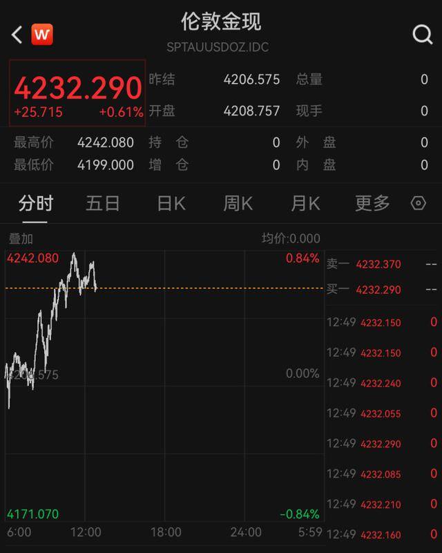 今天,现货黄金盘中一度突破4240美元/盎司,已连续四个交易日创下历史新高。 | W | | 伦敦金现 | | | | | | --- | --- | --- | --- | --- | --- | --- | | | | SPTAUUSDOZ.IDC | | | | | | 4232.290 | 昨德 | | 4206.575 | 思章 | | 0 | | +25.715 | +0.61% 井富 | | 4208.757 | 现手 | | 0 | | 最高价 | 4242.080 搜 | 色 | 0 | 外 | | 0 | | 最低价 | 4199.000 | 增 仓 | 0 | A | | 0 | | 分时 | 五日 | 日K | 唐K | EK | 中文 | | | 叠加 | | | | 均价:0.000 | | | | 4242.080 | | | | 0.84% | 4239 370 | | | | | | | | 2- 4232.290 | | | | | | | | 12:49 4232.150 | 0 | | | | | | | 12:49 4232.150 | 0 | | | | | | 0 ...