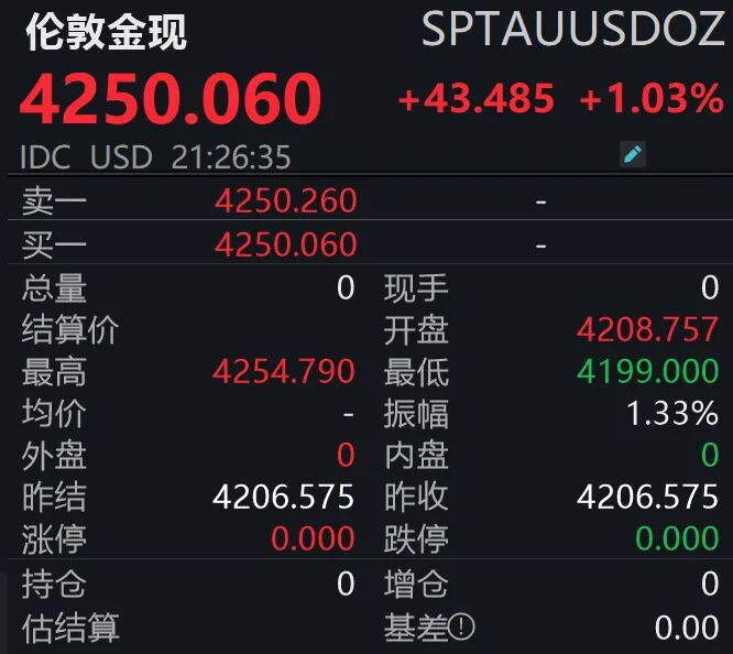 黄金还在涨。 10月16日,国际金价稳稳站上4200美元/盎司上方,并延续涨势。截至记者发稿,伦敦金现报4250.06美 元/盎司,日内涨1.03%,盘中最高触及4254.79美元/盎司,再创历史新高。 | 伦敦金现 | | | SPTAUUSDOZ | | --- | --- | --- | --- | | 4250.060 | | | +43.485 +1.03% | | IDC USD 21:26:35 | | | 0 | | 卖一 | 4250.260 | | | | 买一 | 4250.060 | | | | 总量 | 0 | 现手 | 0 | | 结算价 | | 开盘 | 4208.757 | | 貴高 | 4254.790 | 最低 | 4199.000 | | 均价 | | 振幅 | 1.33% | | 外壁 | 0 | 内盘 | 0 | | 昨结 | 4206.575 | 昨年收 | 4206.575 | | 涨停 | 0.000 | 跌停 | 0.000 | | 持仓 | 0 | 增仓 | 0 | | 估结算 | | 基差1 | 0.00 | 期货方面,COMEX黄金期货亦实现大涨。截至记 ...