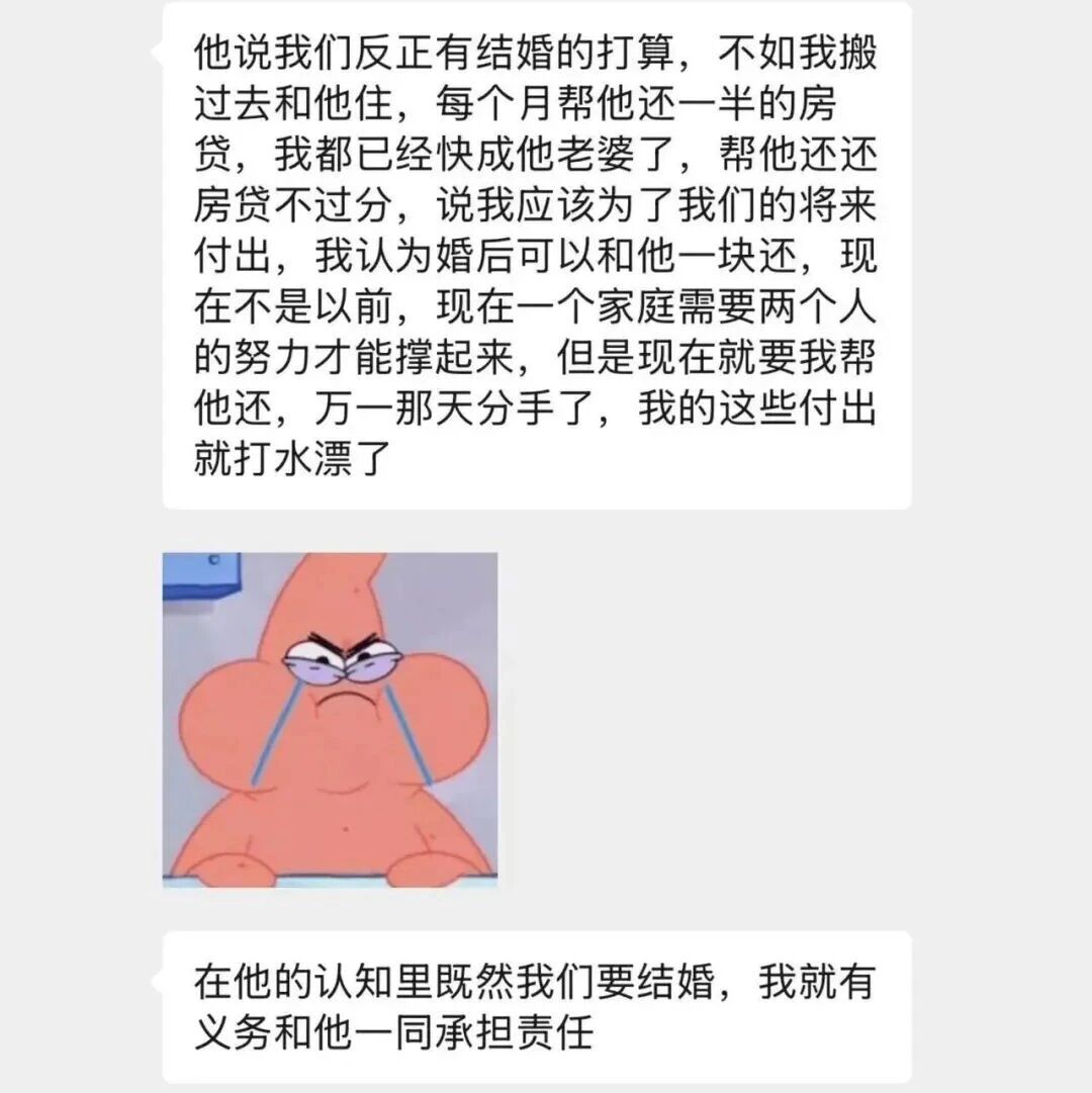 转自:吐槽星君 男朋友还房贷压力大要我出一半? (vi a .@叁川说 ) 过去和他住,每个月帮他还一半的房 贷,我都已经快成他老婆了,帮他还还 房贷不过分,说我应该为了我们的将来 付出,我认为婚后可以和他一块还,现 在不是以前,现在一个家庭需要两个人 的努力才能撑起来,但是现在就要我帮 他还,万一那天分手了,我的这些付出 就打水漂了 在他的认知里既然我们要结婚,我就有 义务和他一同承担责任 % 公众号 · 吐槽星君 09:48 昨晚你说的搬过去和你住,想了一晚上,还 是喜欢一个人住。你觉得房贷压力大,等我 们婚后可以一起还,现在还太早了。 愣住 09:54 今早洗头吹头发又掉好多头发 压力太大了 估摸着昨晚两三点才睡着 10:13 去医院开点药 成年人谁活着不累 买这套为了我们结婚有地方住,租房一个 月一千多,搬过来和我住,帮我分担一些压 力,我们也可以多在一起了解阿 VS 1 11 11 6 公众号 · 吐槽 白天别午睡了 跟午睡没关系,午睡就睡20分钟 睡一两个小时可能会睡多 10:23 你们买房也没和我说过,现在买房太早了, 我们估计要一两年以后才结婚。 跟你说了吧 买了才说 我忘了 10:28 你自 ...