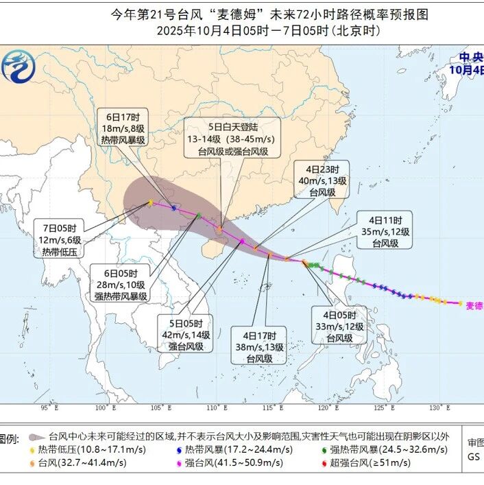 预计,"麦德姆"将以每小时25—30公里的速度向西偏北方向移动,强度逐渐增强,并向广东西部到海南岛东部一带沿海靠近,将于5日白天在广东电白至海南万宁一 带沿海登陆(台风级或强台风级,13—14级,38—45米/秒),登陆后强度逐渐减弱。 最新消息。 中央气象台10月4日6时发布台风橙色预警: 今年第21号台风"麦德姆"今天(4日)凌晨由强热带风暴级加强为台风级,早晨5时其中心位于广东省湛江市徐闻县东偏南方约830公里的南海北部海面上,就是北纬 18.0度、东经117.7度,中心附近最大风力有12级(33米/秒),中心最低气压为975百帕,七级风圈半径300—380公里,十级风圈半径80—100公里。 海口:将梯次实施"六停" 海口市防灾减灾救灾消防和安全生产委员会发布关于实施"六停"的预告称,根据气象预报,今年第21号台风"麦德姆"将于10月5日白天在文昌登陆或近海擦过,预计 将对海口市造成严重影响,期间沿海陆地将出现8—10级大风,11—13级阵风,并伴有暴雨到大暴雨,局地特大暴雨。为确保人民群众生命财产安全,海口市拟定于 10月4日下午到5日在全市范围内梯次实施"停课(培训机构)、停工、停运、停航、停园、 ...