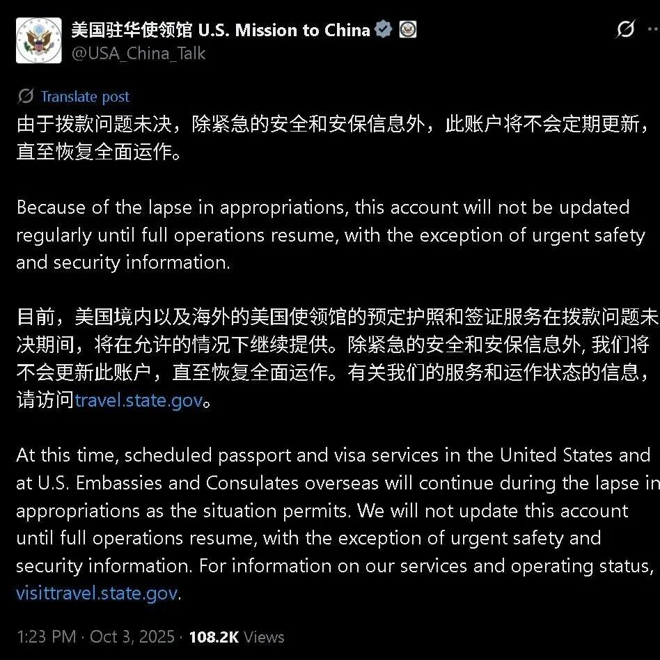 突然宣布。 北京时间10月3日下午1时23分,美国驻华使领馆在美国社交平台X上的官方账号上宣布,由于拨款问题未解决,除紧急的安全和安保信息外,此账户将不会定期更 新,直至恢复全面运作。 此前,由于美国国会两党无法就延长联邦政府资金的临时拨款法案达成一致,美国政府已经于当地时间10月1日凌晨零时起陷入"停摆"状态。 来源:环球时报 责编:李丹 校对:陶谦 版权声明 证券时报各平台所有原创内容,未经书面授权,任何单位及个人不得转载。我社保留追 究相关 行 为主体法律责任的权利。 转载与合作可联系证券时报小助理,微信ID:SecuritiesTimes END 点击关键字可查看 潜望系列深度报道丨 股事会专栏 丨 投资小红书 丨 e公司调查 丨 时报会客厅 丨 十大明星私募访谈 丨 假期重磅!商务部,最新发声! 丨 今日,港股、 A50集体回调! 丨 突发!美国一炼油厂爆炸起火!国际油价拉升 丨 命里带"金",3天翻倍!这只大牛股,再迎利好! 丨 巴菲特突发!重仓股暴跌,最新出 手→ 丨 特朗普警告!可能会裁员 丨 回应"纸老虎"言论!普京"呛声"特朗普:那北约又算什么?! 丨 深夜!中概股,继续大涨! 丨 全球最 ...