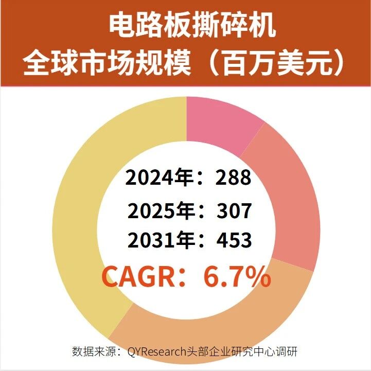 电路板撕碎机是一种专门用于电子废弃物回收处理的重型机械设备,主要用于对废弃印刷电路板( PCB )进行物理破碎处理。该设备采用高强度合金刀具和精 密传动系统,通过剪切、撕裂和冲击等多重作用力,将整块电路板分解为尺寸均匀的碎片(通常为 2-20mm )。设备配备全封闭式破碎腔体和多级除尘系统, 可有效控制破碎过程中产生的粉尘和有害气体。同时,设备采用模块化设计,可根据处理量需求配置不同功率的驱动系统和筛网规格,适用于处理各类规格的 印刷电路板,包括刚性板、柔性板和多层复合板等。该设备是电子废弃物资源化回收生产线中的关键预处理设备,为后续的金属分选和非金属材料回收提供重 要基础。 全球电子废弃物产生量持续快速增长,每年超过 5000 万吨的电子垃圾中含有大量可回收的贵金属和稀有金属,这直接推动了电路板撕碎机市场的快速发展。随 着各国环保政策的不断加强和循环经济理念的深入推广,电子废弃物资源化处理需求显著提升。在技术层面,设备制造商不断优化刀具材料和改进破碎腔体结 构,致力于提高设备处理能力和使用寿命,同时降低能耗和维护成本。 根据 QYResearch 最新调研报告显示, 预计 2 03 1 年全球电路板撕碎机市 ...