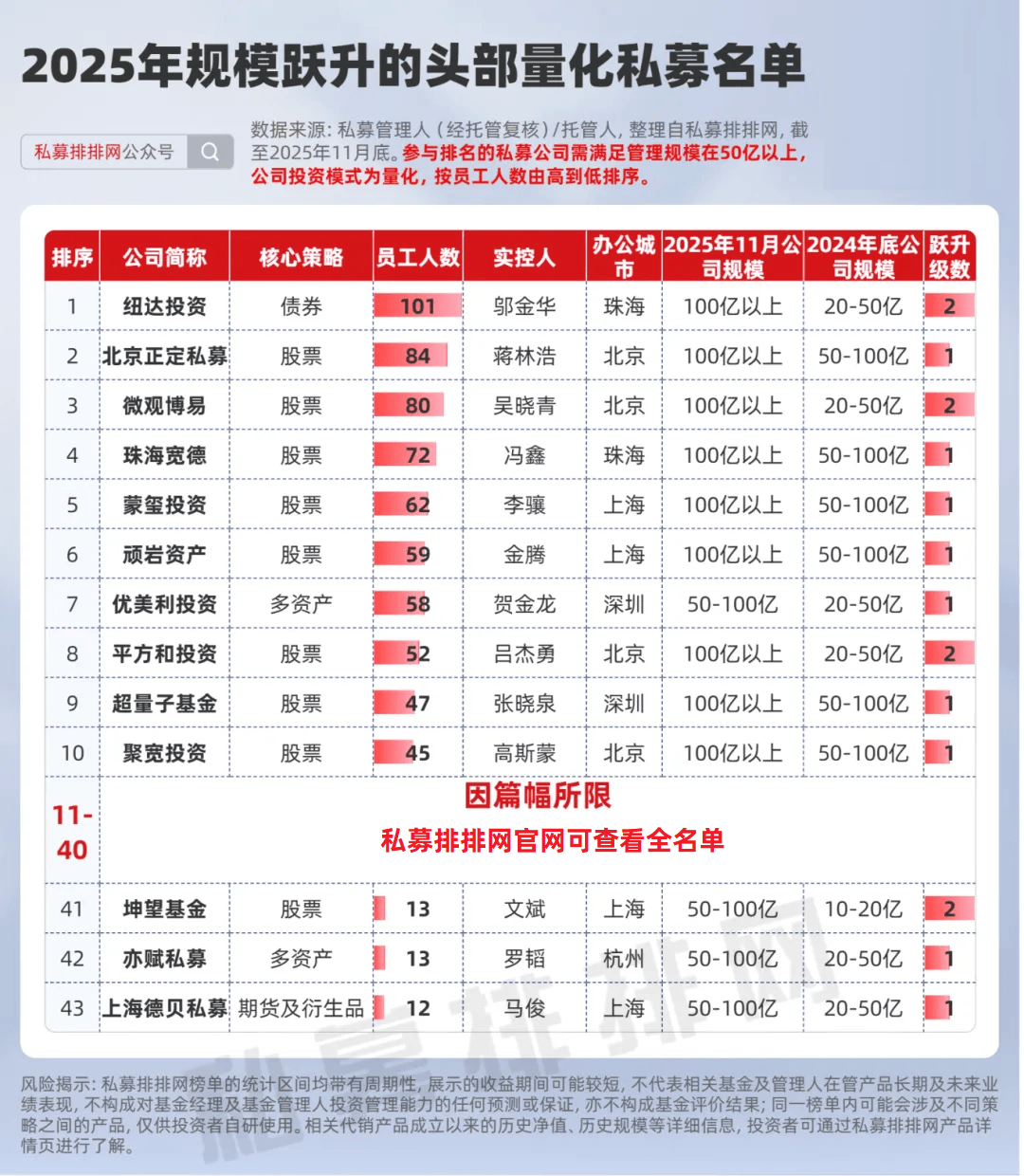 2025年已接近尾声,量化私募今年在业绩、规模、产品备案、出海等多个方面均迎来大丰收。私募排排网数据显示,截至2025年11月底,头部量化私募 (规模50亿以上)从2024年底的63家大幅增加至91家。此外,头部量化私募的年内备案产品数和获得9号牌照的数量成为头部私募中的"主力"。从业绩层 面来看,今年来至少有3只产品符合排名规则的头部量化私募共有61家,平均收益为31.71%,大幅跑赢同期沪深300指数17.94%的涨幅,且全部实现正收 益。 接下来,笔者将结合2025年1-11月的业绩,从规模跃升、9号牌照、备案数量几个角度为大家盘点头部量化私募最新状况,并为大家筛选出短中长期(近 1、3、5年)业绩均位居前列的头部量化私募。 43家头部量化实现规模跃升!海南盛丰等私募跃升多级 规模方面,今年头部量化私募阵营迎来一波"大换血"。在91家头部量化私募中,远和私募是唯一一家今年完成备案、并于年内突破50亿规模的私募。 若和2024年底相比,48家头部量化私募规模不变,3家私募掉出头部阵营。值得注意的是,实现规模跃升的头部量化私募共有43家,占比接近50%,多于 主观私募的41家。 | 排序 | 公司简称 | ...