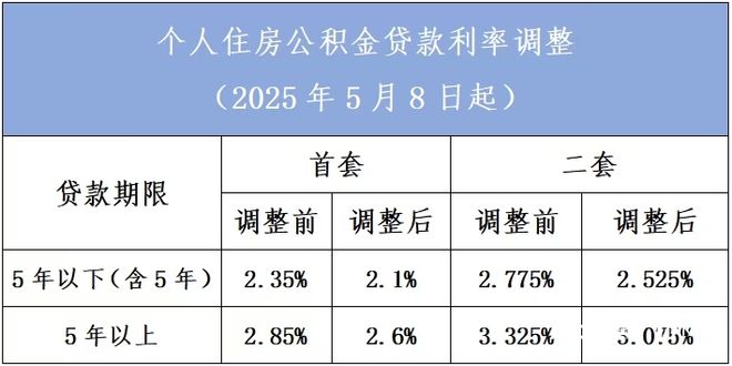 近日 昆明市住房公积金管理中心发布通知 自2026年1月1日起 2025年5月8日前 已发放的住房公积金贷款 (即存量住房公积金贷款) 贷款利率将自动下调 借款人无需办理任何手续 详情如下 ↓↓↓ 有住房公积金贷款的小伙伴注意啦!自 2026年1月1日起,2025年5月8日前已发放 的住房公积金贷款(即存量住房公积金贷 款),贷款利率将自动下调,借款人无需办 理任何手续。 2025年5月8日(含)后发 放的住房公积金贷款已执行新利 率,不在此次调整范围内。 调多少? 新目利率一目了然 根据《中国人民银行关于下调个人住房 公积金贷款利率的通知》要求,自2025年5 月8日起,下调个人住房公积金贷款利率 0.25个百分点。 EFA 版 | 贷款期限 | 首套房 | | 二套房 | | | --- | --- | --- | --- | --- | | | 调整前 | 调整后 | 调整前 | 调整后 | | 1-5年 (含5年) | 2.35% | 2.1% | 2.775% | 2.525% | | 5年以上 | 2.85% | 2.6% | 3.325% | 3.075% | 省多少? 举个例子算算看 利率下调 ...