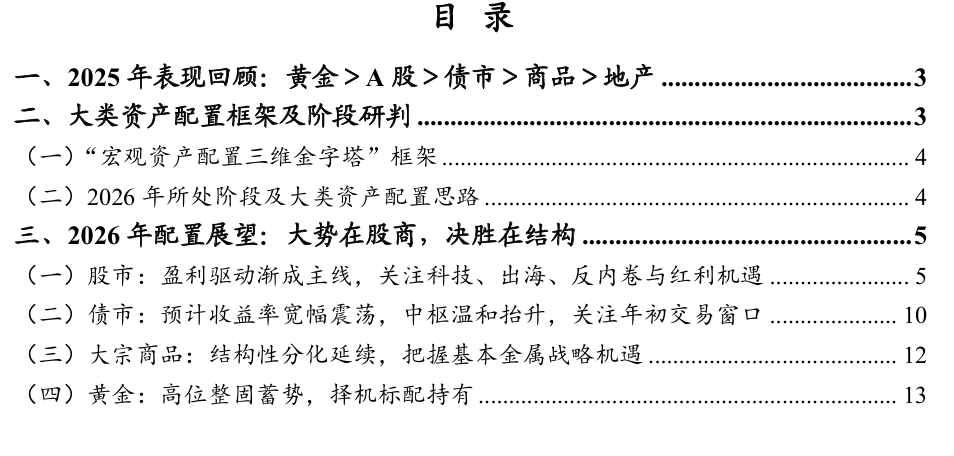炒股就看金麒麟分析师研报,权威,专业,及时,全面,助您挖掘潜力主题机会! 来源:明察宏观 文 财信研究院宏观团队 伍超明、胡文艳、李沫、段雨佳 核心观点 一、2025年表现回顾 在金融周期下行、全球秩序重构与产业革命深化三重力量驱动下,2025年大类资产表现分化。黄金价格 在全球秩序加速重构严重削弱美元信用的推动下罕见大涨超60%;A股因"DeepSeek时刻"等被系统性重 估,呈现以新经济为主的结构性牛市;债市因"资产荒"逻辑弱化与经济再平衡政策步入震荡;原油与房 地产价格则持续调整。 二、大类资产配置框架及阶段研判 基于"宏观资产配置三维金字塔"框架,2026年市场处于复杂过渡期。战略层,国内仍处于金融周期下行 阶段,需维持整体防御基调;扰动层,地缘政治风险从混乱转向有序对抗,但仍需对"黑天鹅"事件保持 警惕;战术层,大概率呈现"经济见底上行+金融宽松收敛"组合,为把握商品与股票的结构性机会提供 了窗口。综上,2026年大类资产配置核心思路在于:战略防御为基;战术适度进取;全程管理管理。 三、2026年配置展望:大势在股商,决胜在结构 股市:在经济基本面改善、资金面充裕及估值合理的背景下,A股有望迎来盈利 ...