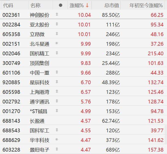 股票频道更多独家策划、专家专栏,免费查阅>> 责任编辑:栎树 另外,中信证券研报称,截至2025年12月中SpaceX已成功将3095颗星链卫星送入轨道,国内有望研发 出对标猎鹰9号的可回收中型运载火箭,运力瓶颈即将突破拐点将至。随着发射成本大幅下降,卫星、 终端、算力等市场有望加速兑现,商业航天的投资主线地位即将得到确认。随着中国星网和G60千帆星 座先后进入批量化发射阶段,以及海南商业航天发射场和商业运载火箭的投入使用,大运力、低成本趋 势正引领商业航天开启新时代,同时空间算力也进一步打开行业天花板,万亿市场规模的新赛道即将扬 帆起航,为相关产业链带来巨大的发展契机。从投资端看,目前锐度较高的方向是太空算力和可回收火 箭,而低轨通信卫星链是目前最先有基本面逻辑和订单支持的细分。 | 代码 | 名称 | | 涨幅% ↓ | 总市值 | 年初至今涨幅%。 | | --- | --- | --- | --- | --- | --- | | 002361 | 神剑股份 | 1 | 10.04 | 85.50亿 | 66.25 | | 002284 | 亚太股份 | 1 | 10.01 | 111亿 | 95.34 ...
