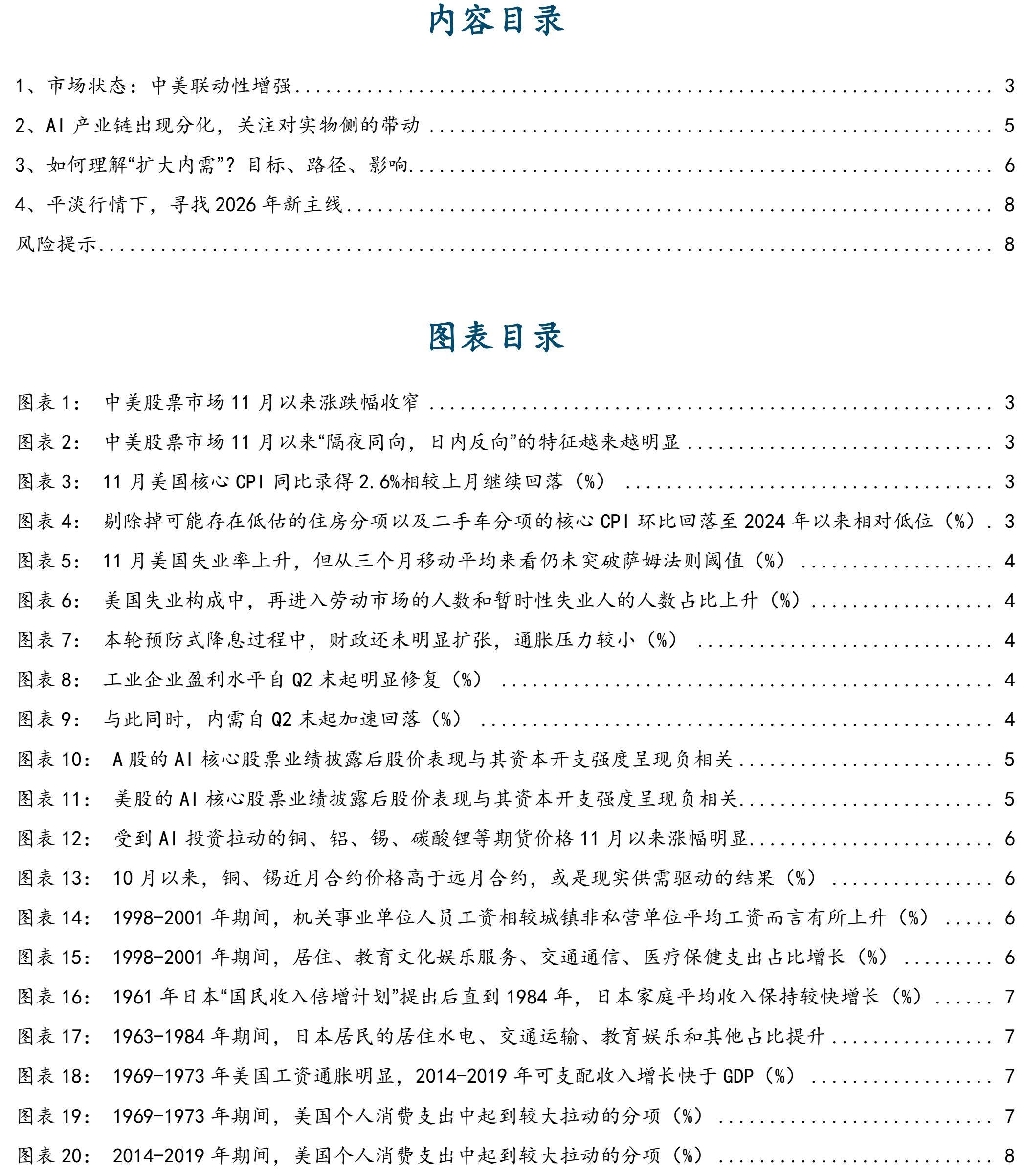市场状态:中美联动性增强 - 11月以来A股与美股波动同步收窄,沪深300与标普500的20日涨跌幅相关性升至年内90%分位以上,呈现“隔夜同向、日内反向”特征 [1][5] - 美国经济处于“金发姑娘”状态,11月核心CPI同比降至2.6%,为2021年4月以来最低,失业率升至4.6%但主要由劳动参与率提高和暂时性失业贡献,未触发“萨姆法则” [1][8] - 中国经济呈现“企业盈利底”已现、内需动能回落的组合,为后续政策加力打开窗口 [1][8] - 参考上一轮降息周期经验,财政出现明显扩张且直接作用于居民后通胀才会进一步上行,大宗商品上行窗口期较长 [1][8] AI产业链:行情分化与实物侧投资 - AI产业链投资出现两大特征:行情向受益于宏观效应的“泛AI”资产(铜锂铝、储能、电气设备)扩散,表现优于AI核心资产(算力芯片、光模块、PCB)[2][17] - 投资者对AI公司“激进资本开支缺乏营收增长反哺”的矛盾容忍度下降,10月下旬以来中美AI核心股股价表现与其资本开支占营收比例呈负相关 [2][17] - 实体投资层面趋势强劲,受AI投资拉动的铜、铝、锡、碳酸锂等大宗商品期货价格自10月下旬以来持续上涨,铜和锡近月合约强于远月合约,体现供需驱动 [2][18] - AI产业链高度关联,美国优势在上游(GPU、大模型),中国优势在中游制造(光模块、PCB、散热),增量信息同时影响两地市场 [17] 扩大内需:目标、路径与影响 - 居民增收计划从二次分配入手,2025年已通过提高养老金最低标准、发放育儿补贴提高净转移支付收入 [3][25] - 未来优化初次分配(提高劳动报酬)可能是重点,例如以国企为代表引导薪酬改革,2026年或将看到消费税扩围与征收环节后移、企业所得税有效税率提升 [3][25] - 历史经验表明,居民收入增长将带动服务消费与新型消费占比提升 [3] - 中国1998-2001年机关事业单位加薪周期带动居住、教育娱乐、交通通信、医疗保健支出占比上升 [25] - 日本1961-1984年“收入倍增”时期,美国1969-1973年及2014-2019年居民收入跑赢GDP阶段,服务与新型消费占比均持续抬升 [3][28] 2026年投资主线:从单一产业到双轮驱动 - 投资主线从单一的AI产业叙事,转向“实物需求拉动”与“内需政策红利”双主线 [4][38] - 主线一:继续看好AI投资与全球制造业复苏共振的工业资源品,包括铜、铝、锡、锂、原油及油运 [4][38] - 主线二:抓住入境修复与居民增收叠加的消费回升通道,包括航空、酒店、免税、食品饮料 [4][38] - 主线三:受益于资本市场扩容与长期资产端回报率见底的非银金融,包括保险、券商 [4][38] - 主线四:具备全球比较优势且周期底部确认的中国设备出口链(电网设备、储能、锂电、光伏、工程机械、商用车、照明)以及国内制造业底部反转品种(印染、煤化工、农药、聚氨酯、钛白粉)[4][38]