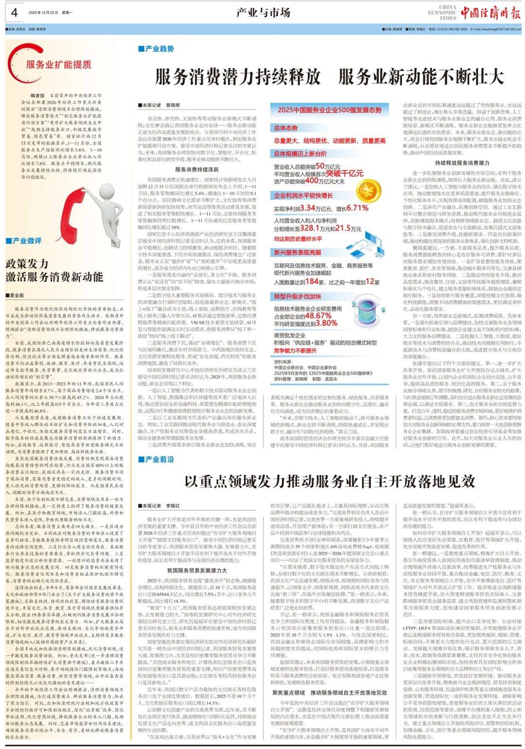 服务业扩能提质 编者按 日前召开的中央经济工作会议在部署2026年经济工作重点任务时提出"清理消费领域不合理限制措施,释放服务消费潜力""制定服务业扩能提质行动方 案""有序扩大服务领域自主开放""鼓励支持服务出口,积极发展数字贸易、绿色贸易"等。国家统计局12月15日发布的数据显示,1—11月份,全国服务业 生产指数同比增长5.6%。1—10月份,规模以上服务业企业营业收入同比增长7.6%。服务业平稳增长,现代服务业发展持续向好,将持续引领我国经济行 稳致远。 产业微评 ■夏金彪 服务消费作为现代经济结构优化升级的重要标志,正日益成为推动经济高质量发展的重要内生动力。近期召开的中央经济工作会议对明年经济工作重点任 务作出部署,明确提出"清理消费领域不合理限制措施,释放服务消费潜力"。 目前,我国经济已由高速增长阶段转向高质量发展阶段,服务消费在满足人民日益增长的美好生活需要、优化经济结构、促进就业等方面发挥着越来越重 要的作用。服务消费不仅涵盖餐饮、旅游、教育、医疗、养老等民生领域,还延伸至数字服务、体育赛事、文化娱乐等新兴业态,成为拉动经济增长 的"新引擎"。 数据显示,在2013—2023年的11年间, ...