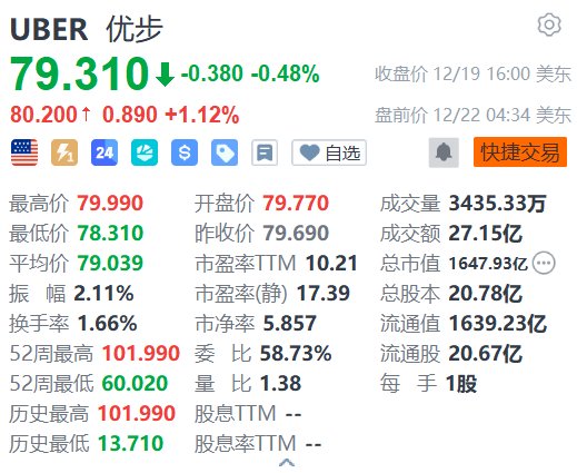 | UBER 优步 | Ol | | --- | --- | | 79.310 4 -0.380 -0.48% | 收盘价 12/19 16:00 美东 | | 80.200 + 0.890 +1.12% | 盘前价 12/22 04:34 美东 | | 一 7 24 4 8 | ● 快捷交易 | | 最高价 79.990 开盘价 79.770 | 成交量 3435.33万 | | 最低价 78.310 昨收价 79.690 | 成交额 27.15亿 | | 平均价 79.039 市密率 M 10.21 | 总市值 1647.93亿( …) | | 振 幅 2.11% 市盈率(静) 17.39 | 总股本 20.78亿 | | 换手率 1.66% 市净率 5.857 | 流通值 1639.23亿 | | 52周最高 101.990 委 比 58.73% | 流通股 20.67亿 | | 52周最低 60.020 量 比 1.38 | 每 手 1股 | | 历史最高 101.990 股息TTM -- | | | 历史最低 13.710 股息率TM -- | | 优步(UBER.US)盘前涨1.12%,报80.2 ...