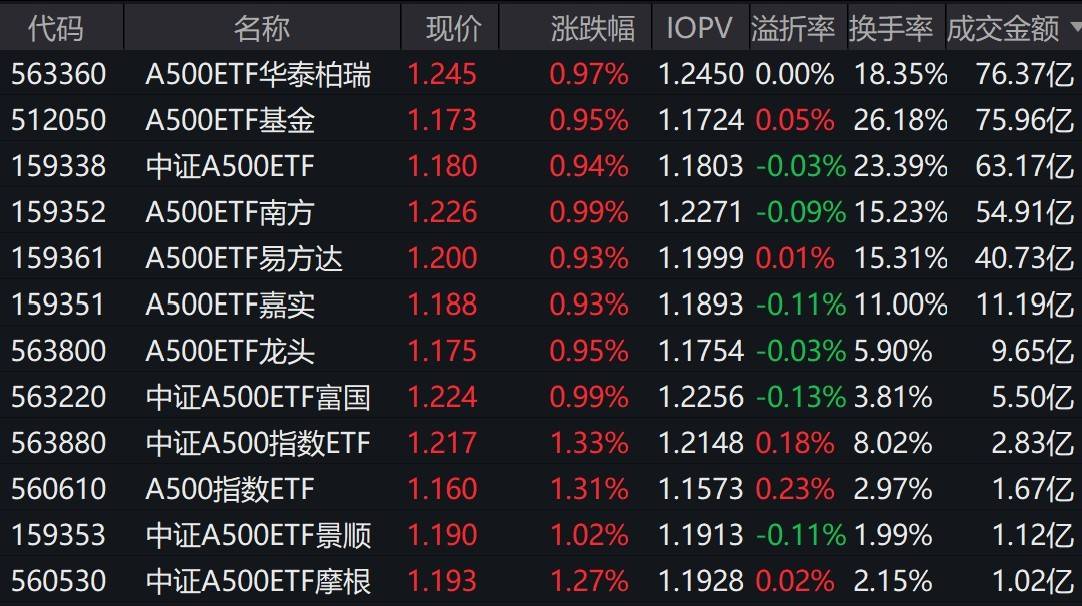 市场早盘集体走强,沪指收复3900点关口,中证A500指数上涨1.06%。从板块来看,海南自贸概念集体爆发,商业航天概念反复走强,算力硬件概念表现 活跃,半导体设备股盘中拉升;下跌方面,AI医疗概念震荡回落。 截至上午收盘,场内跟踪中证A500指数的ETF小幅上涨。其中,有12只中证A500相关ETF成交额超1亿元,3只超63亿元。A500ETF华泰柏瑞、A500ETF基 金、中证A500ETF早盘成交额分别为76.37亿元、75.96亿元、63.17亿元。 有券商表示,随着外围不确定因素陆续明朗,短期影响A股的外部压力趋于消退。近期一系列重要会议所释放的政策利好,共同营造了有利于风险资产表 现的环境,跨年行情或将在市场共识凝聚中徐徐展开。 | 代码 | 名称 | 现价 | 涨跌幅 | IOPV 溢折率 换手率 成交金额 | | | --- | --- | --- | --- | --- | --- | | 563360 | A500ETF华泰柏瑞 | 1.245 | 0.97% | 1.2450 0.00% 18.35% 76.37亿 | | | 512050 | A500ETF基金 | 1.173 | 0 ...