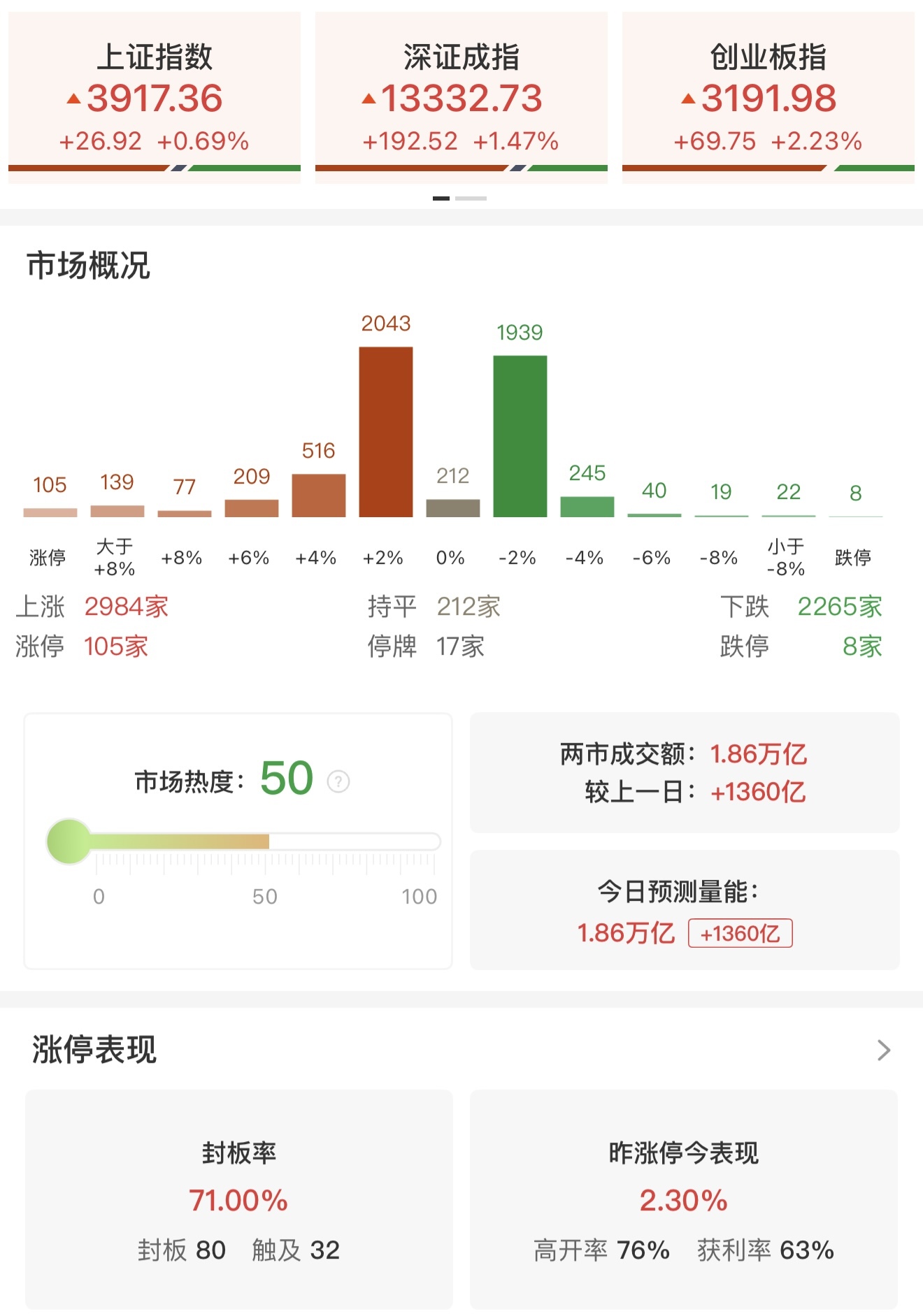 截至收盘,沪指涨0.69%,深成指涨1.47%,创业板指涨2.23%。 盘面上,市场热点快速轮动, 全市场超2900只个股上涨,其中有105只个股涨停。 从板块来看,海南自贸概念全线爆发,海汽集团、海南海药等近 20股涨停。算力硬件概念表现活跃,新易盛再创历史新高,长飞光纤4天3板。机器人概念股午后拉升,首开股份、卧龙电驱等多股涨停。商业航天 概念反复走强,神剑股份回封涨停。下跌方面,影视院线概念下挫,博纳影业跌停。 板块方面,海南自贸区、贵金属、算力硬件等板块涨幅居前,医药商业、影视院线、教育、银行等板块跌幅居前。 今日A股市场高开高走,三大指数集体反弹,创业板指涨超2%。沪深两市成交额1.86万亿,较上一个交易日放量1360亿。 下载财联社APP获取更多资讯 准确 快速 权威 专业 7x24h电报 头条新闻 VIP资讯 实时盯盘 ...