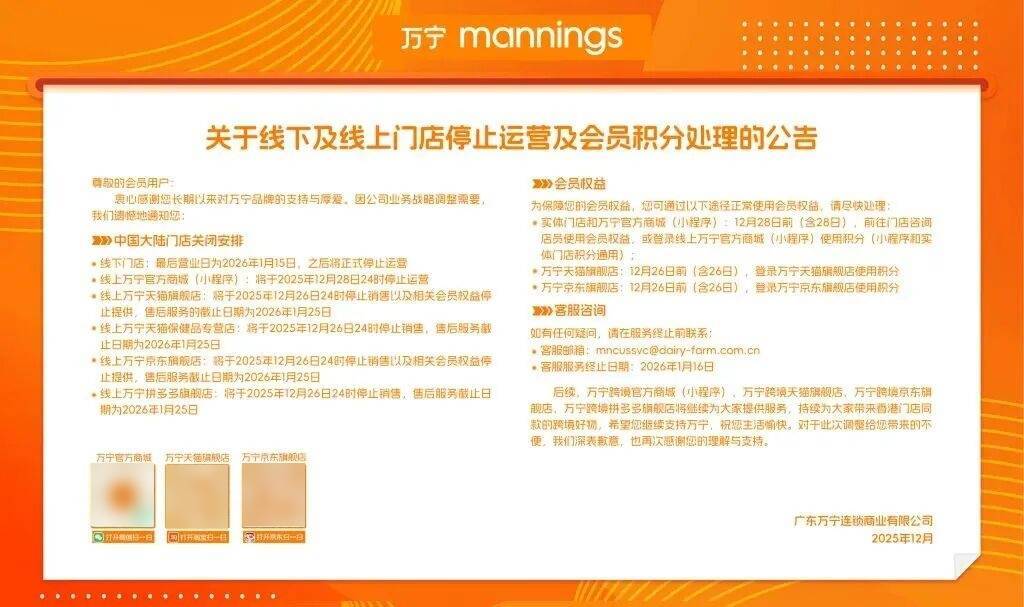 万宁退出中国大陆市场 - 知名连锁品牌万宁宣布关闭其在中国大陆的所有线下门店 线下门店将于2026年1月15日停止运营 [1] - 线上销售渠道也将陆续关闭 官方商城(小程序)于12月28日关闭 天猫、京东等旗舰店于12月26日停售 [1] - 售后服务将截止至2026年1月25日 会员需在对应日期前使用积分 但公司的跨境商城业务将继续运营 [1] 公司背景与市场表现 - 万宁1972年创始于香港 于2004年进入中国内地市场 [3] - 公司于2011年在中国内地市场达到发展高峰 门店数量超过200家 覆盖33个城市 [3] - 公司主营业务包括护肤、健康等品类 并于2015年开设了跨境业务 [3] - 近年来 公司受到线上渠道冲击 线下零售压力增大 面临经营困境 [3] 行业竞争与挑战 - 万宁的竞争对手屈臣氏同期也在优化其在内地的店铺组合 关闭人流不足的门店 [3] - 屈臣氏同时加强了线上布局 其线上订单处理中心已增加至394家 [3] - 根据长和2025年财报 屈臣氏全球店铺总数增长2%至16935家 但其中国区门店数量减少了4% 亚洲及欧洲业务表现则相对稳健 [3] - 行业专家指出 万宁因早期市场策略保守 未能成功适应电商转型 是导致其面临困境的主要原因 并指出公司需要通过科技创新寻求突破 [3]
