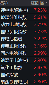 A股主要指数拉升,创业板指涨1.08%,沪指涨0.47%,深证成指涨0.83%。能源金属、锂矿、电池、贵 金属、光刻机、有机硅、PCB等概念涨幅居前;全市约2000股上涨,3300股下跌。 股票频道更多独家策划、专家专栏,免费查阅>> 责任编辑:栎树 | 名称 | 涨跌幅 | | --- | --- | | 锂电电解液指镂 | 7.23% | | 玻璃纤维指数 | 5.61% | | 动力电池指数 | 3.79% | | 锂电负极指数 | 3.73% | | 锂电池指数 | 3.22% | | 锂电正极指数 | 3.16% | | 固态电池指数 | 2.99% | | 钠离子电池指镂 | 2.90% | | 氟化工指数 | 2.87% | | 锂矿指数 | 2.90% | | 磷酸铁锂电池排 | 2.80% | ...