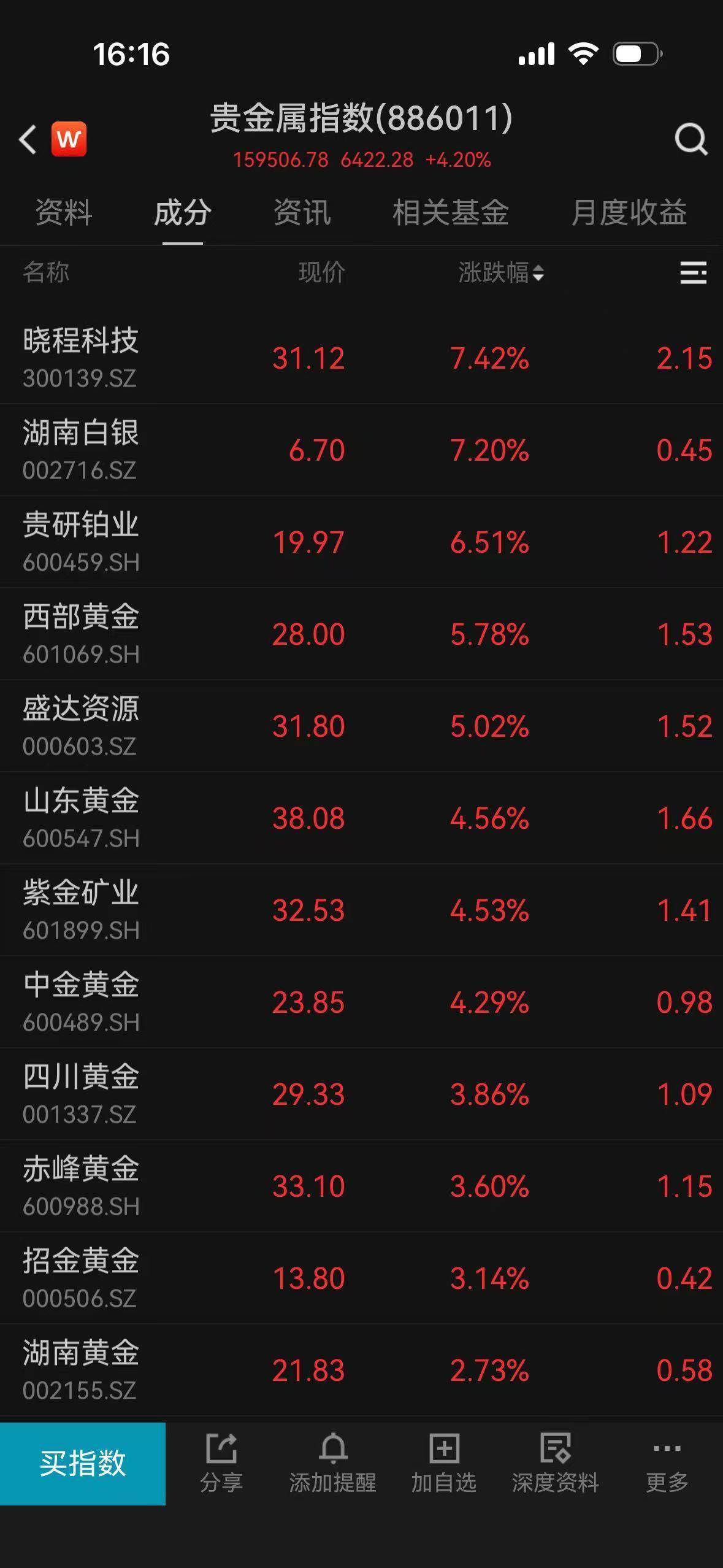 潮新闻客户端 记者 吴恩慧 截至下午4点发稿时,WIND数据显示,现货黄金继续攀升,盘中站上4420美元/盎司,突破10月20日创下的历史纪录(4381.484美元/盎司),再创新高。至 此,现货黄金价格年内涨幅超68%。 | 山东黄金 | | 38.08 | 4.56% | | | | --- | --- | --- | --- | --- | --- | | 600547.SH | | | | | | | 紫金矿业 | | 32.53 | 4.53% | | | | 601899.SH | | | | | | | 中金黄金 | | 23.85 | 4.29% | | | | 600489.SH | | | | | | | 四川黄金 | | 29.33 | 3.86% | | | | 001337.SZ | | | | | | | 赤峰黄金 | | 33.10 | 3.60% | | | | 600988.SH | | | | | | | 招金黄金 | | 13.80 | 3.14% | | | | 000506.SZ | | | | | | | 湖南貢金 | | 21.83 | 2.73% | | | | ...