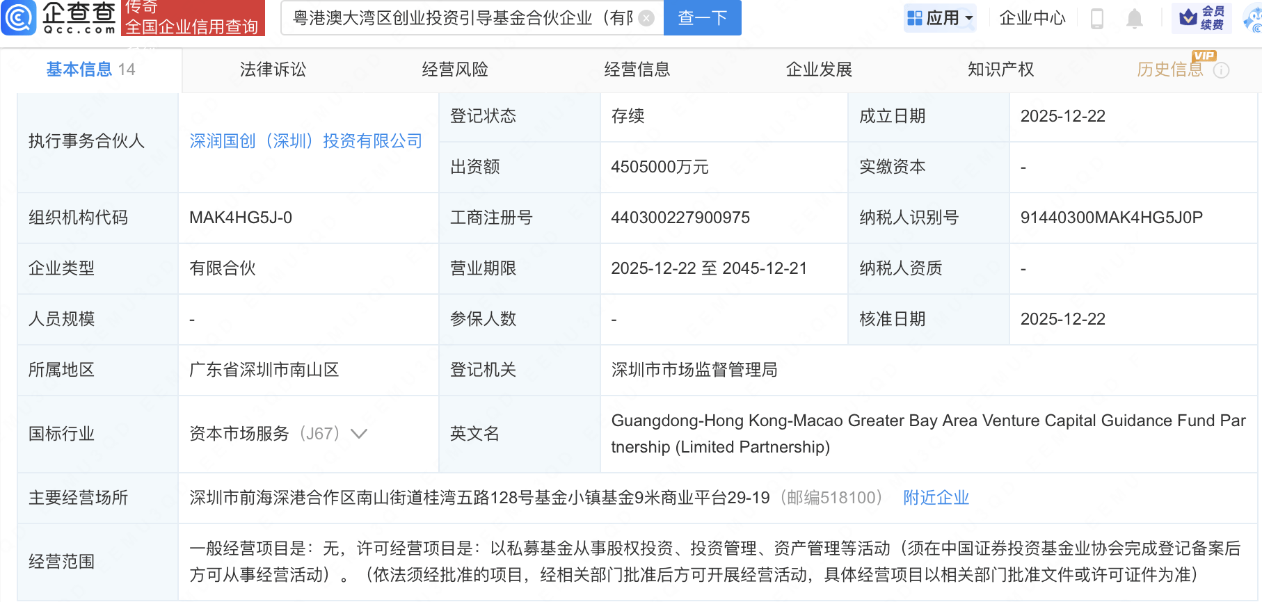 企查查APP显示,近日,粤港澳大湾区创业投资引导基金合伙企业(有限合伙)成立,出资额450.5亿元,经营范围包含:以私募基金从事股权投资、投资 管理、资产管理等活动。企查查股权穿透显示,该企业由深圳市创新投资集团有限公司全资子公司深圳市红土创业投资有限公司、华润资本管理有限公司旗 下华润投资创业(天津)有限公司等共同出资。 | | | 全国企业信用查询 | | 粤港澳大湾区创业投资引导基金合伙企业(有β ◎ | | 查一下 | | --- | --- | --- | --- | --- | --- | --- | | | 基本信息 14 | | 法律诉讼 | 经营风险 | 经营信息 | | | 合伙人信息9 ① | | | E= 股权结构 | | | | | 序号 | | | 合伙人名称 | | 出资比例 ⇒ | 认缴出资额 ÷ | | 1 | | E | 国家创业投资引导基金有限公司 | | 44.3951% | 2000000万元 | | 2 | | 居分 | 深圳市国创引科创投资合伙企业(有限合伙) | | 41.9534% | 1890000万元 | | | + | 引科 | 国有企业 | | | | ...