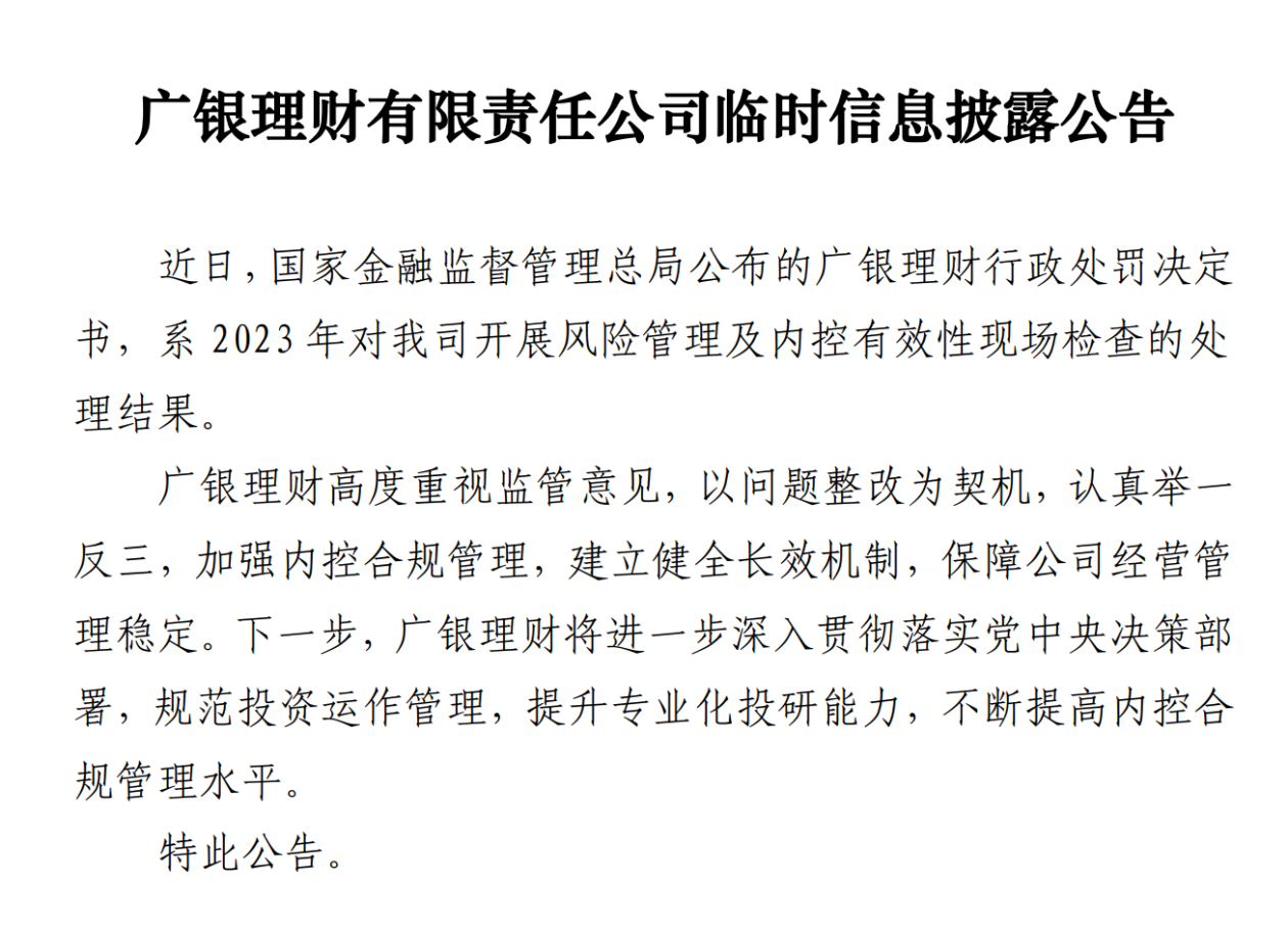 【环球网财经综合报道】日前,国家金融监督管理总局公布了一项行政处罚信息公示列表,5家金融机构被罚。其中,2家机构被罚没超千万元,包括农业发 展银行被罚1020万元,广银理财被罚没合计1159.88万元。 从披露的违法违规行为来看,农业发展银行涉及信贷资金投向不合规、贷后管理不到位等。广银理财涉及投资运作不规范、数据管理不审慎、信息登记不及 时等。 公开资料显示,广银理财是广发银行股份有限公司的全资子公司,成立于2021年12月1日,注册资本50亿元人民币。据广银理财2025年上半年报告,截至6月 30日,广银理财共新发产品124只,其中公募产品80只,按金额计总计1567.9亿元,同比减少近128亿元;私募44只,按金额总计102.5亿元,同比增加74.7亿 元。(闻辉) 金融监管总局对农业发展银行罚款1020万元。对广银理财没收违法所得194.94万元、罚款964.94万元,罚没合计1159.88万元。同时,对王光源、王未红警告 并罚款共计40万元。 对此,广银理财发布临时信息披露公告回应,近日国家金融监督管理总局公布的广银理财行政处罚决定书,系2023年对公司开展风险管理及内控有效性现场 检查的处理结果。 ...