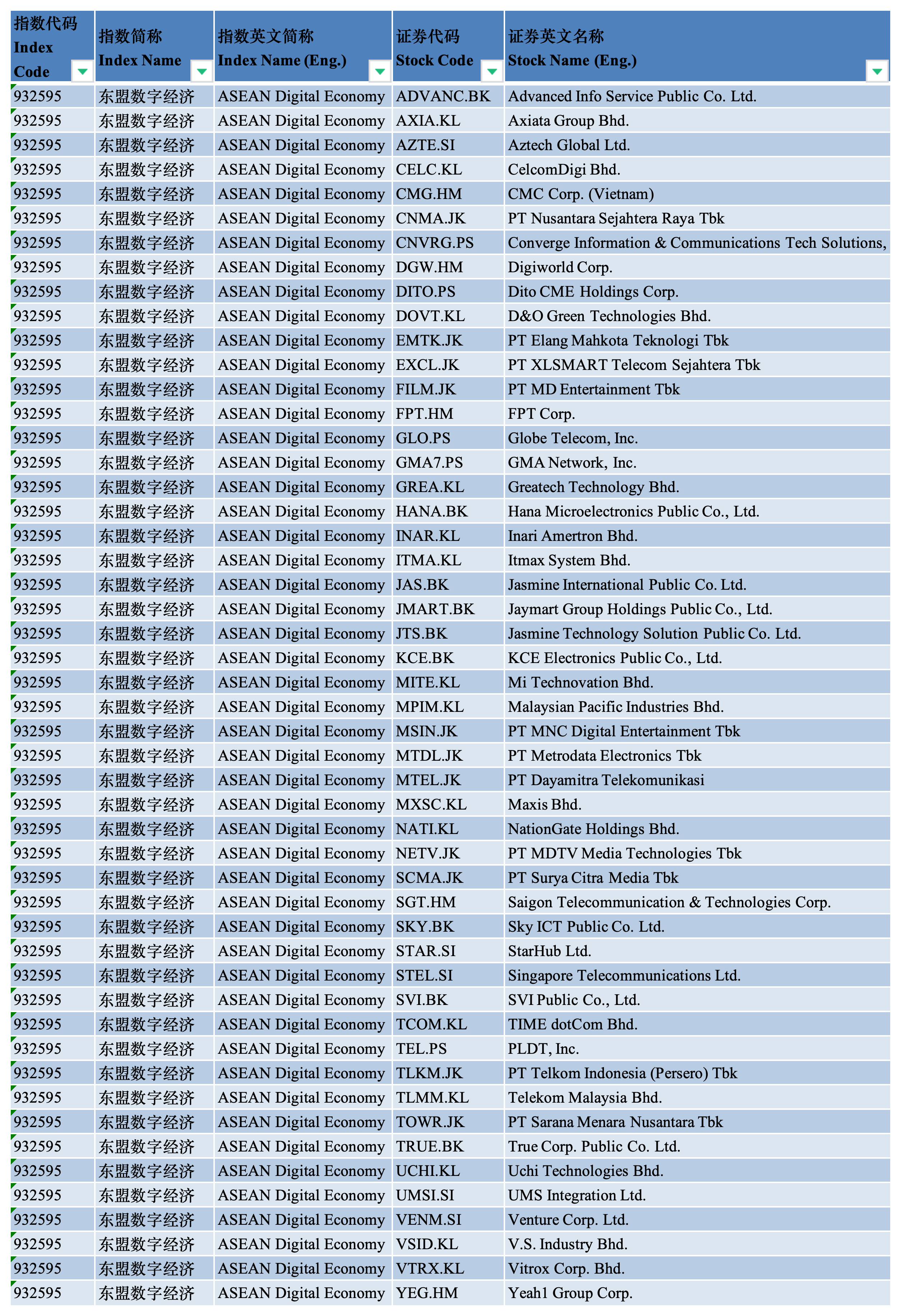 中证东盟数字经济指数从东盟成员国各证券交易所中选取流动性较好、市值较大的50只数字经济领域的上市公司证券作为 指数样本,以反映东盟主要市场数字经济领域上市公司证券的整体表现。 | 指数代码 | 指数简称 | 指数英文简称 | | --- | --- | --- | | Index | Index Name | Index Name (Eng.) | | Code | | | | 932595 | 东盟数字经济 | ASEAN Digital Economy | | 932595 | 东盟数字经济 | ASEAN Digital Economy | | 932595 | 东盟数字经济 | ASEAN Digital Economy | | 932595 | 东盟数字经济 | ASEAN Digital Economy | | 932595 | 东盟数字经济 | ASEAN Digital Economy | | 932595 | 东盟数字经济 | ASEAN Digital Economy | | 932595 | 东盟数字经济 | ASEAN Digital Economy | | 932595 | 东盟数字 ...