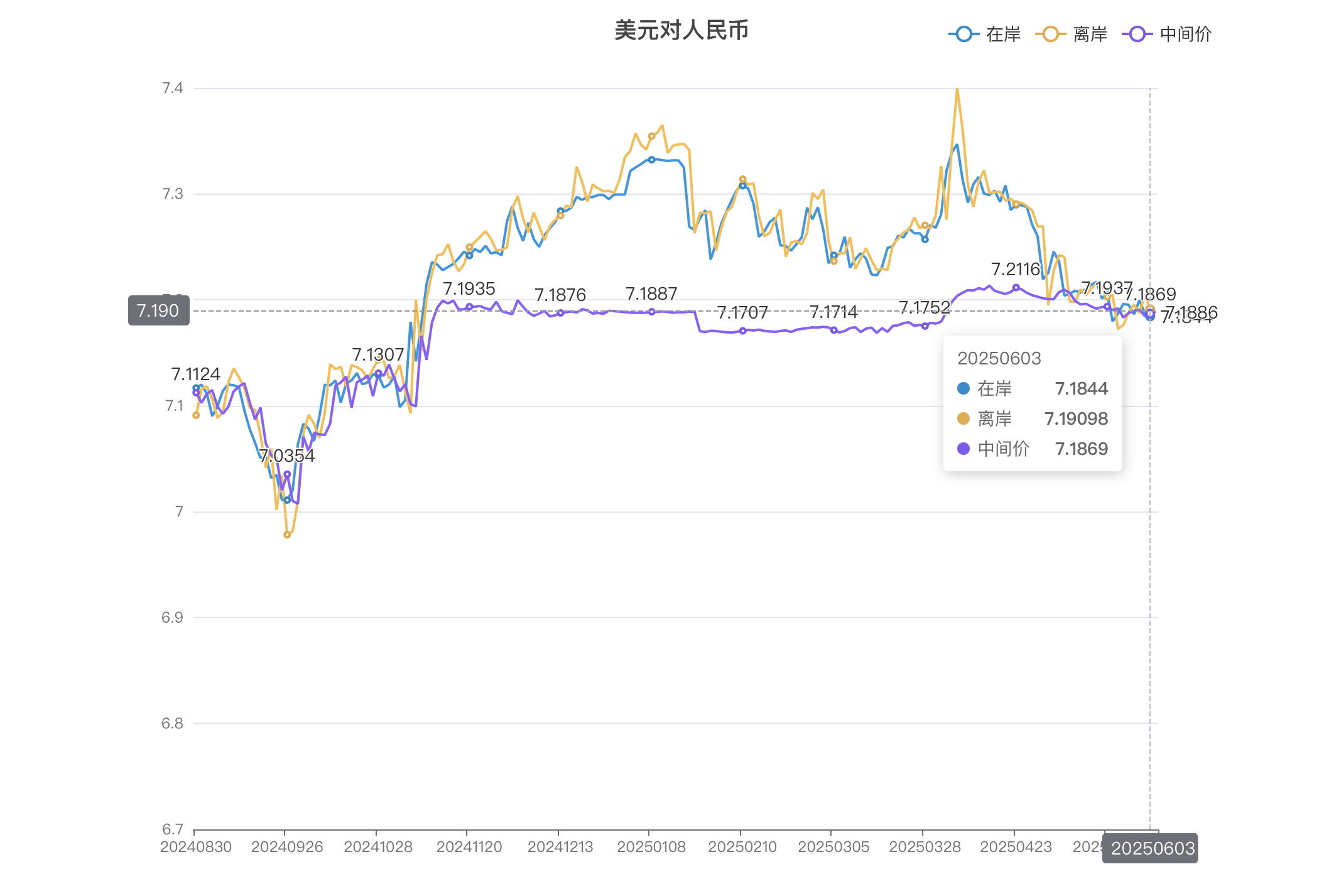 新华财经上海6月4日电(葛佳明) 近期,美元指数波动幅度加大,看涨人民币汇率的预期持续升温,押注人民币升值渐成市场普遍预期。6月4日,在岸人 民币对美元夜盘收报7.1878,较上一交易日夜盘收涨83点;离岸人民币兑美元夜盘收报7.1909元,较上一交易日夜盘涨142点。 图片来源:新华财经 根据新华财经数据,此前,受贸易争端等外部因素影响,4月初人民币汇率中间价较离岸市场人民币对美元汇率曾高出逾1300点,但自5月26日起,离岸市场 人民币对美元汇率多次"反超"人民币中间价,意味着外汇市场的人民币交易氛围正逐步发生新变化,海外资本看好人民币升值前景。 分析师普遍认为,从外汇期权市场的风险指标来看,资金看涨人民币汇率的押注不断抬升。在扰动和支撑因素相对均衡的情况下,下半年人民币汇率或呈现 震荡偏强走势。 人民币汇率或将稳中有升 东吴证券首席经济学家芦哲表示,对于人民币汇率走势,市场渐成"一致性升值预期"。5月份以来,一方面,在岸汇价与中间价之间的偏离程度逐步收窄, 另一方面,由于看涨人民币的市场预期升温,离岸汇价反应更快,与在岸汇价/中间价之间的偏离也快速修复,日内一度出现离岸美元兑人民币汇价低于在 岸汇价的情 ...