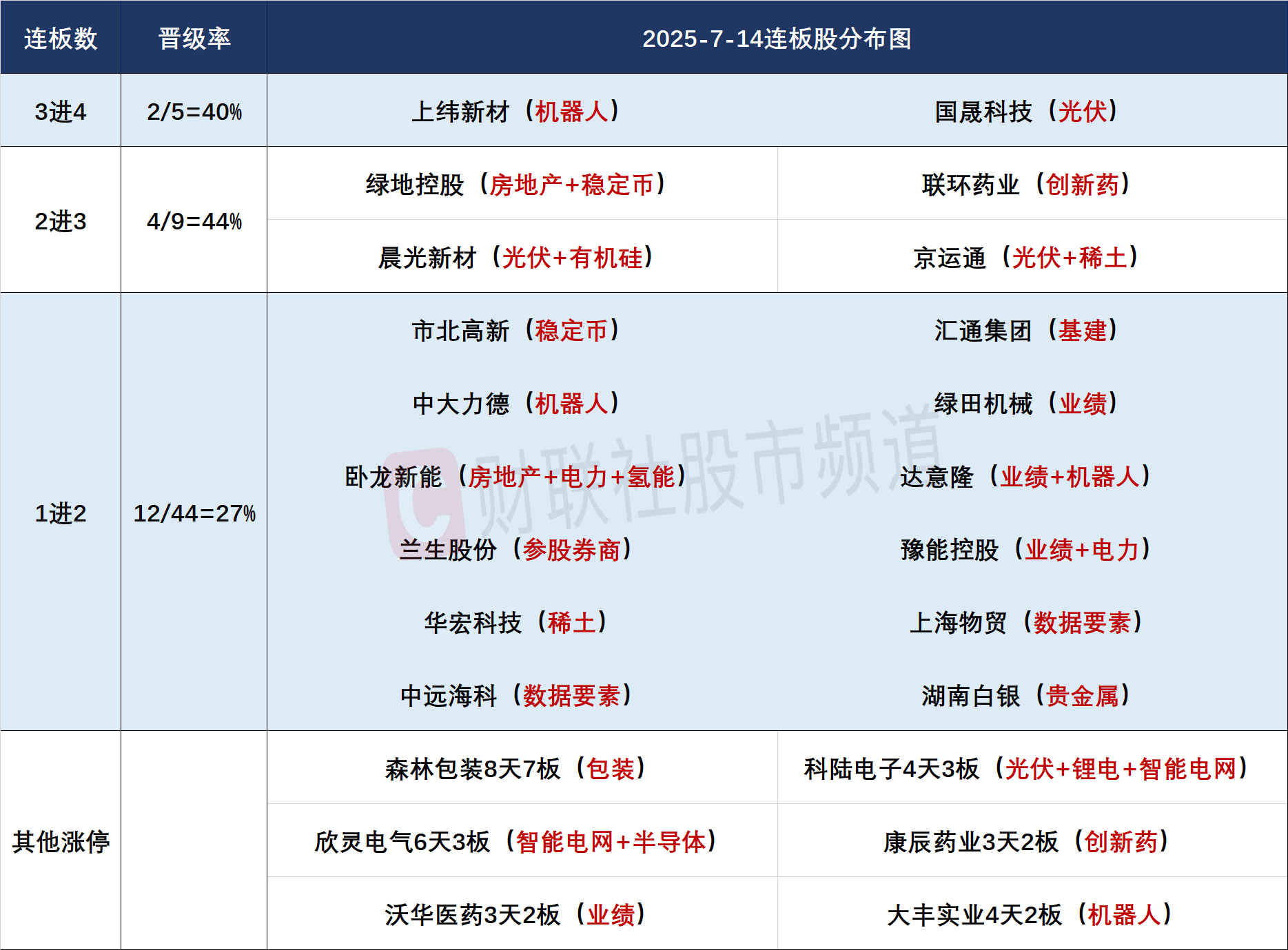今日共63股涨停,连板股总数18只,其中三连板及以上个股6只,上一交易日共17只连板股,连板股晋级率35.29%(不含ST股、退市股)。个股方面,全市 场超3100只个股上涨,但高位股整体亏钱效应持续放大,昨5连板四方新材、昨4连板华媒控股、昨3连板南华期货等跌停。此外,人气股恒宝股份跌超7%, 京北方跌超8%,惠城环保跌超9%。仅少数高位股表现活跃,其中森林包装反包涨停走出8天7板,联环药业缩量加速录得6天5板,楚天龙午后逆势大长腿涨 停等。板块方面,机器人、PEEK材料概念股走强,上纬新材20CM4连板,中大力德2连板,恒工精密、步科股份、长盛轴承等涨超10%,消息面上,智元机 器人和宇树科技成功中标中移(杭州)信息技术有限公司的人形双足机器人代工服务采购项目,总预算高达1.24亿元。 7月14日连板股分析:连板股晋级率35% 高位股亏钱效应持续放大 | 连板数 | 晋级率 | 2025-7-14 | | --- | --- | --- | | 3 #4 | 2/5=40% | 上纬新材 (机器人) | | 2进3 | 4/9=44% | 绿地控股 (房地产+稳定币) | | | | 晨光新材 (光伏+有 ...
