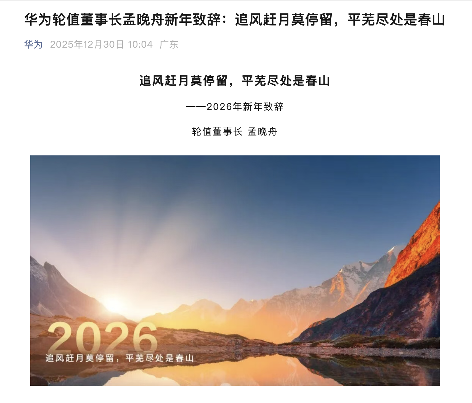 在致辞中,孟晚舟表示,人工智能技术正加速与行业知识融合,从单点效率提升转向对企业核心业务的 系统性价值重构。这场转变不仅是技术的迭代,更是从组织架构、业务流程到企业文化的一次深刻变 革。 在2026年华为将聚焦的主战场中,孟晚舟提到了强化行业垂直作战、构建开源开放的鲲鹏昇腾生态、 繁荣鸿蒙生态以及重构AI数据中心多个方面。 12月30日上午,华为官方公众号发布了轮值董事长孟晚舟的2026年新年致辞《追风赶月莫停留,平芜 尽处是春山》。 "从战略方向到战场胜利的这条道路,遍布暗礁与险阻,但我们别无选择,唯有迎难而上。"孟晚舟 说。 以下为致辞全文: 追风赶月莫停留,平芜尽处是春山 ——2026年新年致辞 轮值董事长 孟晚舟 时光的潮水正漫过2025的岸线,回望这一年的忙碌与奔赴,那些深浅不一的足迹,正是我们奋力向前 的最好见证: 在撒哈拉沙漠南缘,网优工程师穿梭在44℃高温、红土飞扬的街头,厘清网络症结; 在大西洋的七级风浪中,光网专家克服严重晕船,和客户一起定位故障、恢复通信; 在海拔4300米的雪域高原,服务团队缺氧不缺精神,冒着零下15℃的严寒调试光储系统,把绿色电源 送入千家万户; 在凌晨4:30的客户 ...