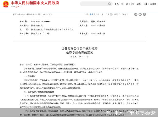 国办发文:2025年秋季起,免除公办幼儿园学前一年保教费