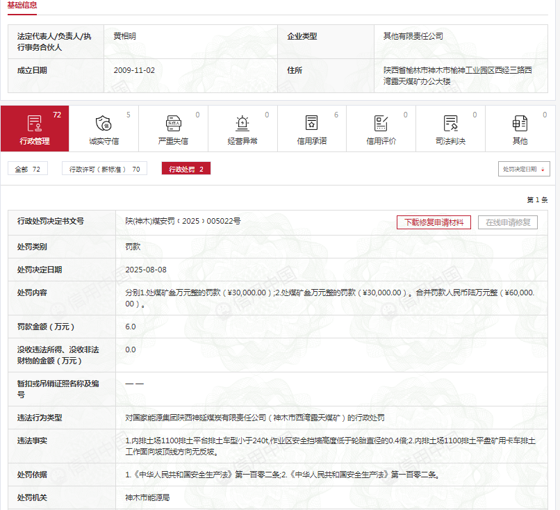 齐鲁晚报·齐鲁壹点记者于信用中国行政处罚栏获悉,8月8日,国家能源集团陕西神延煤炭有限责任公司(下称"国 能神延煤炭")收行政处罚决定书,处罚机关为神木市能源局。 | 行政处罚决定书文号 | 决定安临十罚(2025)14001号 | 下载 必言 首 | 在线申请修复 | | --- | --- | --- | --- | | 处罚类别 | 警告;罚款 | | | | 处罚决定日期 | 2025-05-19 | | | | 处罚内容 | 合并罚款人民币捌万元整(¥80,000.00),警告 | | | | 罚款金额(万元) | 8.0 | | | | 没收违法所得、没收非法 | 0.0 | | | | 财物的金额(万元) | | | | | 暂扣或吊销证照名称及编 | | | | | 를 | | | | | 违法行为类型 | 1.《灯矿安全培训规定》第二十四条:2.《煤矿安全规程》第四条第五款:3.《煤矿安全规程》第十五条:4.《煤矿安全规程》第五 | | | | | 百九十八条:5.《煤矿安全规程》第六百零九条第六项:6.《煤矿安全规程》第五百一十三条 | | | | 违法事实 | 1.高压电工黄合兵,未取得 ...