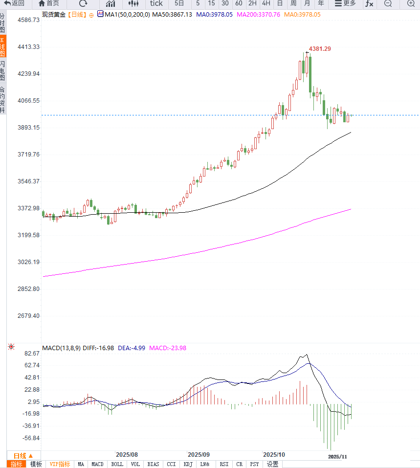 黄金价格表现 - 周四亚洲交易时段黄金价格交投于3970美元/盎司附近 [1] - 金价在4000美元整数关口附近受阻后连续回调,目前处于3950至3970美元区间 [3] 市场影响因素 - 美国私营部门就业岗位增加42000个,超出市场预期并扭转此前两个月的下降趋势 [1] - 就业数据被解读为劳动力市场企稳信号,对降息预期形成压制 [1] - 美元在就业数据公布后走强,导致以美元计价的黄金需求受到抑制 [1] - 美联储主席鲍威尔强调未承诺未来进一步降息,决策将完全依赖数据,导致市场对12月是否继续降息产生分歧 [1] - 美国政府停摆持续且创下历史纪录,不确定性推升对黄金等避险资产的需求 [1] 技术分析 - 黄金价格运行于20日均线下方,MACD指标动能减弱,短期趋势偏弱 [3] - 若金价跌破3950美元支撑,可能进一步下探3920美元 [3] - 若能重新站稳4000美元并突破下降趋势线,则可能重拾上涨动力 [3]