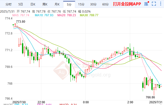 今日周四(7月31日)亚盘时段,黄金期货目前交投于766.86附近,截至发稿,黄金期货暂报767.78元/ 克,跌幅0.69%,最高触及772.44元/克,最低下探766.86元/克。目前来看,黄金期货短线偏向看跌走 势。 【要闻速递】 【最新黄金期货行情解析】 打开APP,查看更多高清行情>> 今日沪金期货需重点关注的关键阻力位区间为794元/克至840元/克,而重要支撑位区间则位于766元/克 至815元/克。 在周三这一天,美国总统特朗普对外宣布,美国将会针对铜管和铜线实施高达50%的关税政策。不过, 此次征税的具体安排并未如市场此前预期的那样进行全面限制,其中并未涵盖铜矿石、铜精矿以及阴极 铜等重要的铜原材料。这一略显意外的决策,迅速引发了市场的强烈反应,致使纽约商品交易所 (COMEX)的美国铜价大幅下挫,跌幅超过17%。与此同时,近几周以来美国铜价相对于伦敦全球指 标铜价所形成的溢价也随之消失殆尽。 韩国总统办公室方面表态称:"我们原本期望的汽车关税税率是12.5%,然而特朗普却坚持要将汽车关 税定为15%。对于日本与美国之间达成的资金协议,我们确实进行了细致入微的审查,并全面收集了与 之相关的各 ...