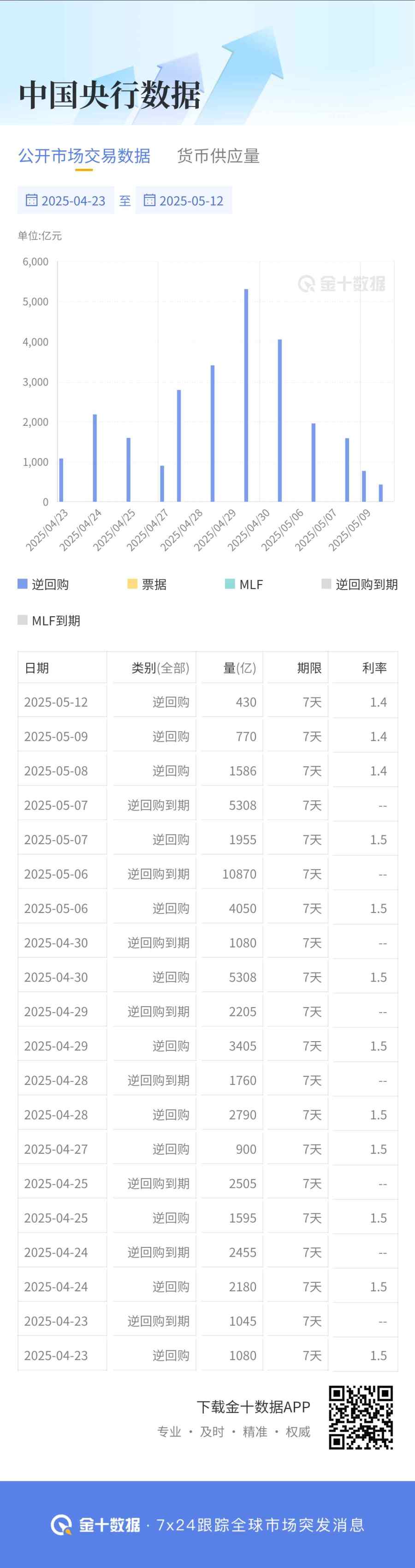 中国央行逆回购操作当日实现净投放430亿元 金十数据5月12日讯,中国央行今日开展430亿元7天期逆回购操作,因今日无逆回购到期,当日实现净投放430亿元。看公开市 场资金流向,到"数据库-中国央行数据"查看>> 逆回购 票据 MLF 逆回购到期 | MLF到期 | 日期 | 类别(全部) | 量(亿) | 期限 | 利率 | | --- | --- | --- | --- | --- | | 2025-05-12 | 逆回购 | 430 | 7天 | 1.4 | | 2025-05-09 | 逆回购 | 770 | 7天 | 1.4 | | 2025-05-08 | 逆回购 | 1586 | 7天 | 1.4 | | 2025-05-07 | 逆回购到期 | 5308 | 7天 | | | 2025-05-07 | 逆回购 | 1955 | 7天 | 1.5 | | 2025-05-06 | 逆回购到期 | 10870 | 7天 | | | 2025-05-06 | 逆回购 | 4050 | 7天 | 1.5 | | 2025-04-30 | 逆回购到期 | 1080 | 7天 | | | 2025-04- ...