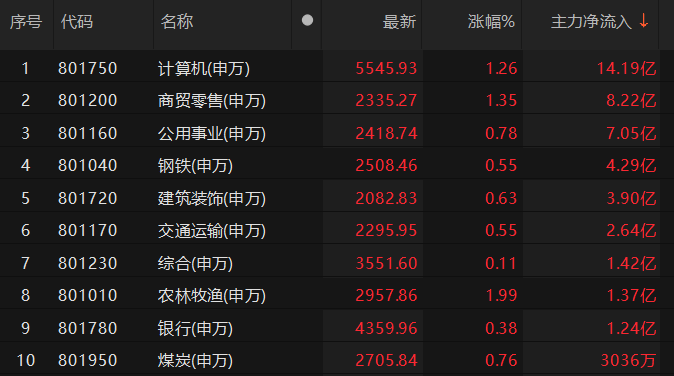 资金流向 - 主力资金净流入计算机板块超14亿元 [1] - 主力资金净流入商贸零售板块 [1] - 主力资金净流入公用事业板块 [1] - 主力资金净流出电子板块近70亿元 [1] - 主力资金净流出机械设备板块55.29亿元 [2] - 主力资金净流出电力设备板块48.70亿元 [2] 行业表现 - 电子板块指数5549.77点 涨幅0.15% [2] - 机械设备板块指数1947.49点 跌幅0.55% [2] - 电力设备板块指数8015.68点 跌幅0.49% [2] - 汽车板块指数7722.97点 跌幅0.41% [2] - 有色金属板块指数5957.01点 跌幅0.08% [2] - 医药生物板块指数9116.64点 涨幅0.51% [2] - 国防军工板块指数1821.27点 跌幅0.03% [2] - 通信板块指数4155.70点 跌幅0.27% [2] - 基础化工板块指数4001.44点 涨幅0.78% [2] - 家用电器板块指数9014.28点 涨幅0.08% [2]