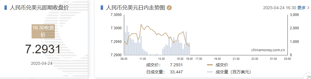 在岸人民币兑美元4月24日16:30收盘报7.2931,较上一交易日上涨24点。