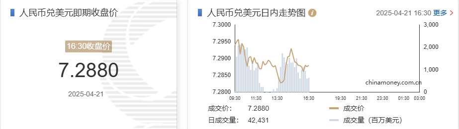 在岸人民币兑美元4月21日16:30收盘报7.2880,较上一交易日上涨159点。 ...