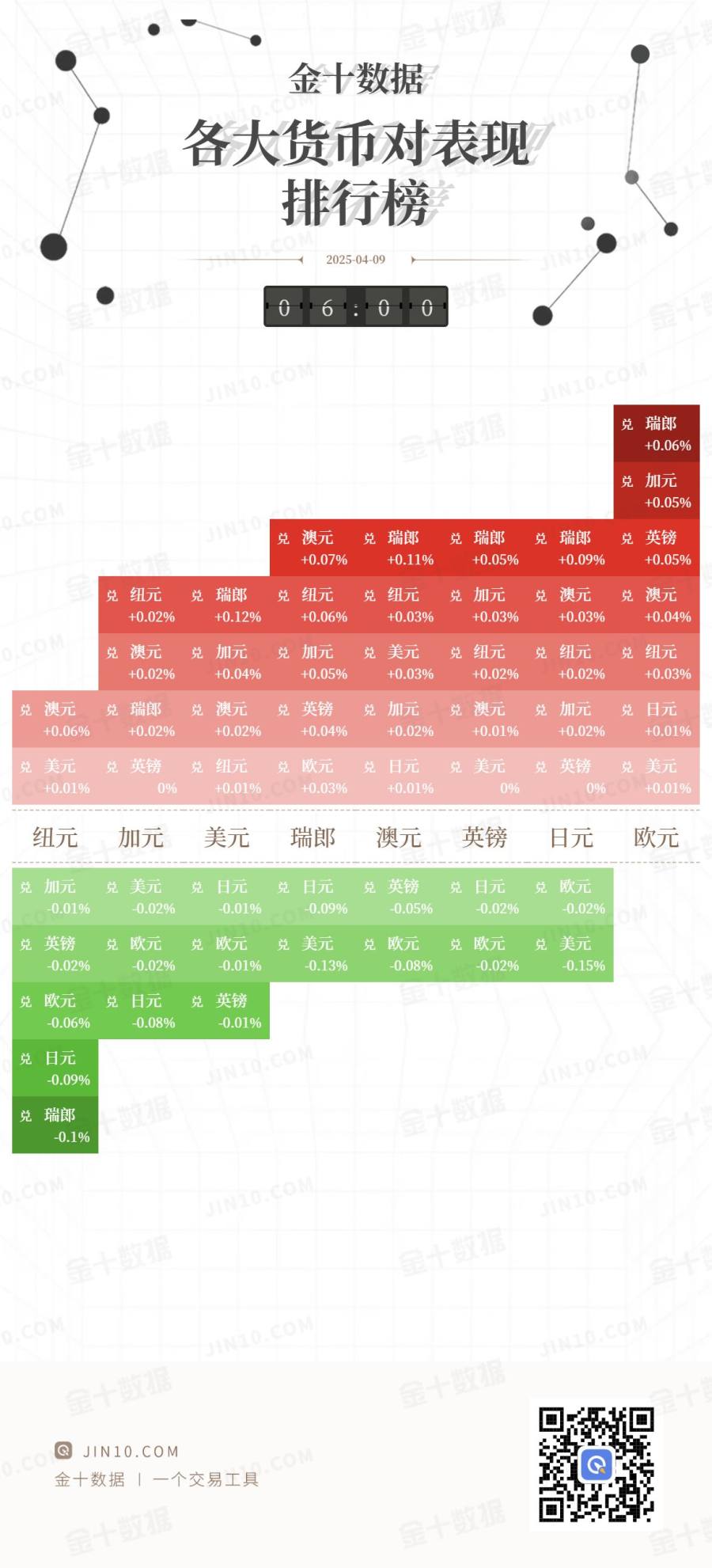 金十图示:2025年04月09日(周三)各大货币对表现 | | | | | | | | | 兑 瑞郎 | | --- | --- | --- | --- | --- | --- | --- | --- | --- | | | | | | | | | | +0.06% | | | | | | | | | | 兑 加元 | | | | | | | | | | +0.05% | | | 兑 澳元 兑 瑞郎 | | | | | 兑 瑞郎 | 兑 瑞郎 | 兑 英镑 | | | | | | +0.07% | +0.11% | +0.05% | +0.09% | +0.05% | | | | 兑 纽元 | 兑 瑞郎 | 兑 纽元 | 兑 细元 | 兑 加元 | 兑 澳元 | 兑 澳元 | | | | +0.02% | +0.12% | +0.06% | +0.03% | +0.03% | +0.03% | +0.04% | | | | 兑 澳元 | 兑 加元 | 兑 加元 | 兑 美元 | 兑 细元 | 兑 纽元 | 兑 纽元 | | | | +0.02% | +0.04% | +0.05% | +0.03% | +0. ...