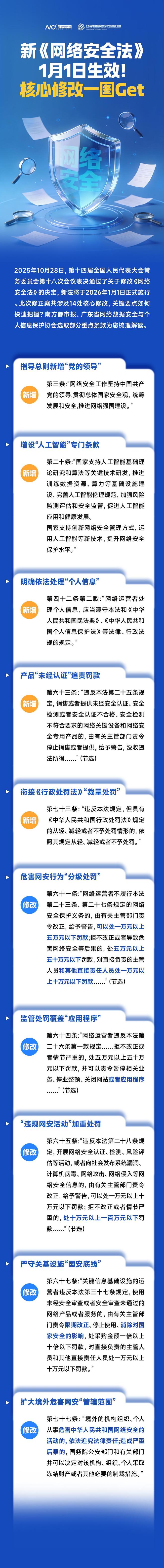 2025年10月28日,第十四届全国人民代表大会常务委员会第十八次会议表决通过了关于修改《网络安全 法》的决定,新法将于2026年1月1日正式施行。这是该法自2017年施行以来的首次重大修订,修改涉 及"四个强化与一个衔接",包括充实网络安全工作指导原则;进一步完善相关处罚规定;并增加促进人 工智能应用和健康发展的内容;在个人信息保护方面进一步做好与《民法典》《个人信息保护法》的衔 接等。 新的《网络安全法》关键要点如何快速把握?南方都市报、广东省网络数据安全与个人信息保护协会选 取部分重点条款为您梳理解读。 2025年10月28日,第十四届全国人民代表大会常 务委员会第十八次会议表决通过了关于修改《网络 安全法》的决定,新法将于2026年1月1日正式施行 。此次修正案共涉及14处核心修改,关键要点如何 快速把握?南方都市报、广东省网络数据安全与个 人信息保护协会选取部分重点条款为您梳理解读。 指导总则新增"党的领导" 新增 第三条:"网络安全工作坚持中国共产 党的领导,贯彻总体国家安全观,统筹 发展和安全,推进网络强国建设。" 增设"人工智能"专门条款 新增 第二十条:"国家支持人工智能基础理 论研究和算法 ...