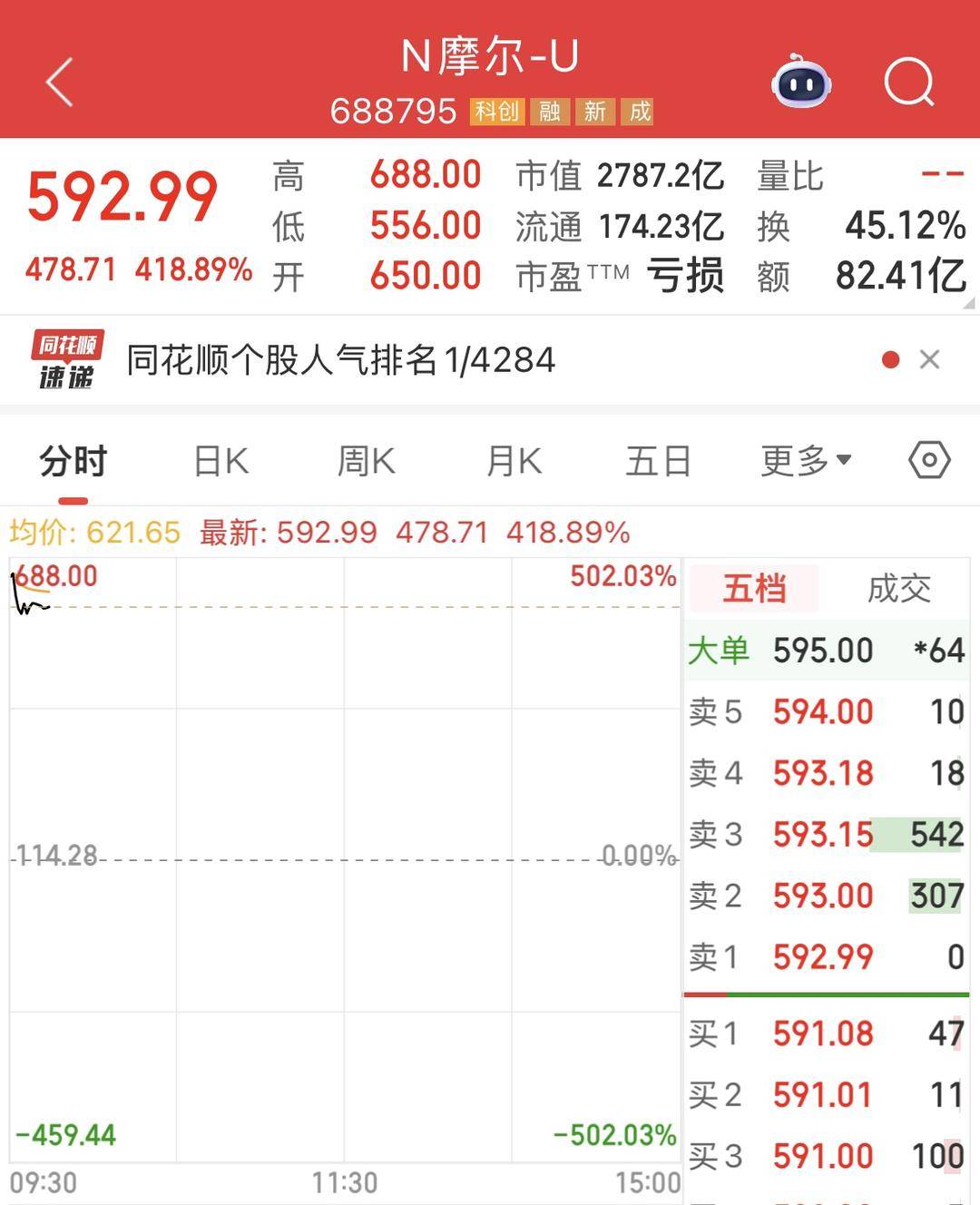 【导读】摩尔线程登陆科创板,盘初一度涨超500% 中国基金报记者 李智 12月5日,被称为"国产GPU第一股"的摩尔线程登陆科创板。 今日开盘, 摩尔线程竞价高开468%, 一度大涨超500 %, 随后震荡调整。截至发稿,该 股报604.99元/股,总市值为2844亿元。投资者 中一签 可 盈利近2 7 万元。 | W | N摩尔-U(688795) | | | | --- | --- | --- | --- | | 交易中 12-05 09:32:28 融 | | | | | 604.99 8 46.66亿 | 股本 4.70亿 | | 市盈 -196 万得 | | 490.71 429.39% 换 24.58% | 市值1 2844亿 | 盘口 市净 24.70 V | | | 分时 王日 | 周K | 月K | 更多 ◎ | | 叠加 | | 均价:646.13 盘口 资金 | | | 688.00 A. | | 502.03% 卖五 606.89 | 14 | | | | 卖四 606.00 | 7 | | | | 卖三 605.99 | 35 | | | | 【】 Hak 605.07 | 4 | ...