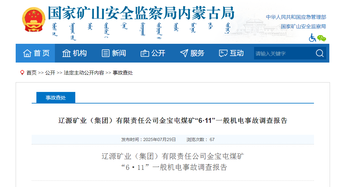 齐鲁晚报·齐鲁壹点记者于国家矿山安全监察局内蒙古局事故查处栏了解到,7月29日,其公示了辽源矿业(集团)有限责任公司金宝屯煤矿(下称"辽源矿 业金宝屯煤矿")"6·11"一般机电事故调查报告。经调查认定,这是一起井下电气作业工违章带电吊挂高压电缆作业时触电造成的生产安全责任事故。 工人接触电缆冷补段漏电点 导致触电身亡 调查报告内容显示,2025年6月11日15时30分许,辽源矿业(集团)有限责任 公司金宝屯煤矿发生一起一般机电事故,造成1人死亡,直接经济损失119.89 万元。 此事故发生在辽源矿业金宝屯煤矿井下南翼三采区运输巷配电点附近,事故经过为:6月11日7时30分许,机电区工人孙某国组织召开班前会,布置当班作业 任务,安排电器班组臧某才、于某东2人到南翼S305综采工作面接线作业。9时许,当班人员陆续入井。15时10分许,臧、于两人在S305综采工作面完成接 线作业后,共同步行前往三采区运输巷配电点准备下班。 当日15时25分许,于、臧两人先后通过三采区运输巷第二道风门。于某东走在前看见孙某国和刘某阳正在检查移动变电站运行发出的异响,随即加入,一起 对变电站进行检查。臧某才在风门附近吊挂电缆。15时 ...