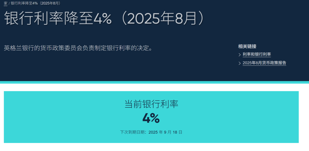英国央行8月货币政策:降息至4% 通胀短期回升但中期趋稳