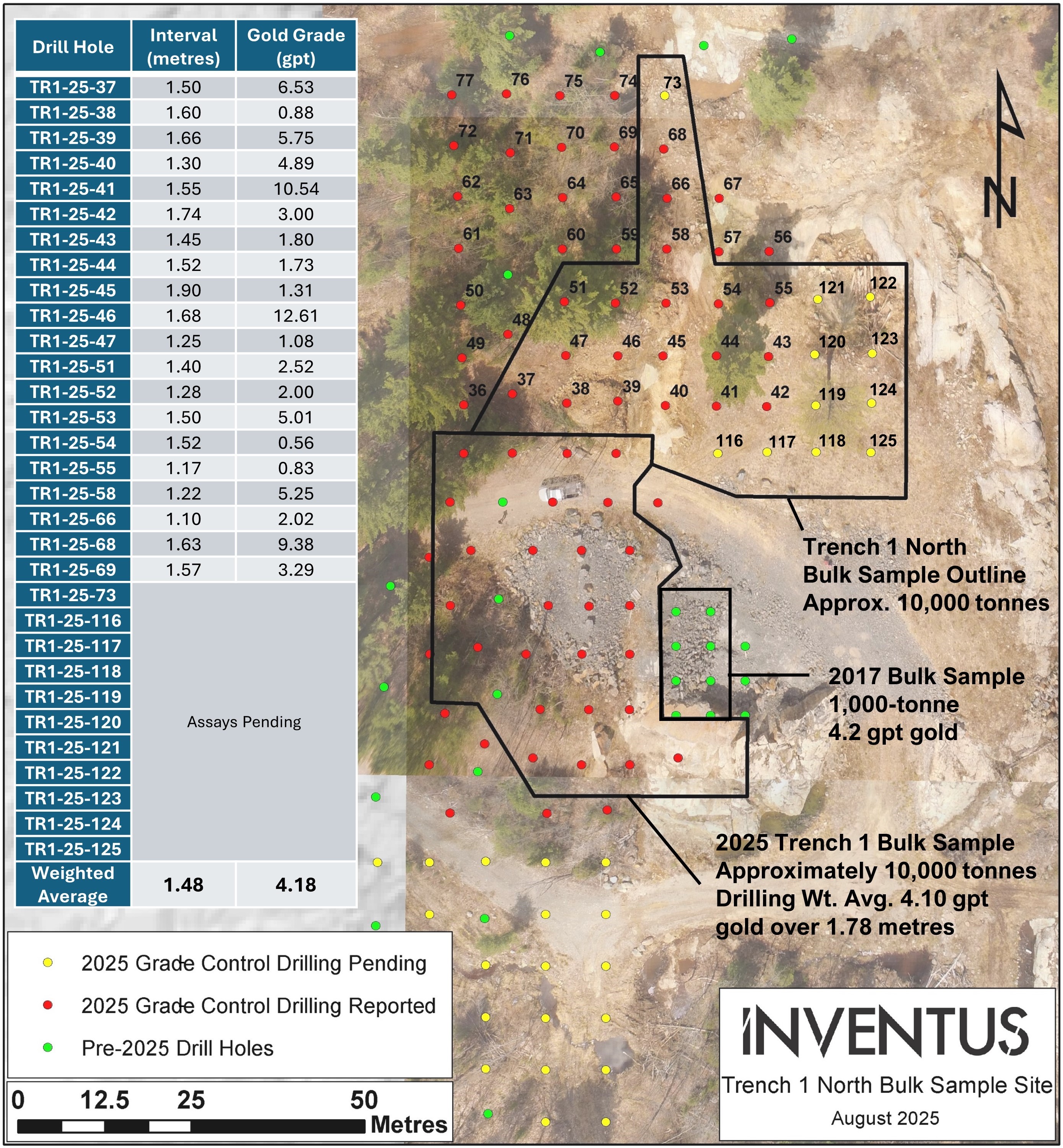 Inventus Reports 4.18 gpt Gold and 1.48 Metre Average for Initial Trench 1 North Grade Control Drilling and Provides Update on Bulk Sample Operation