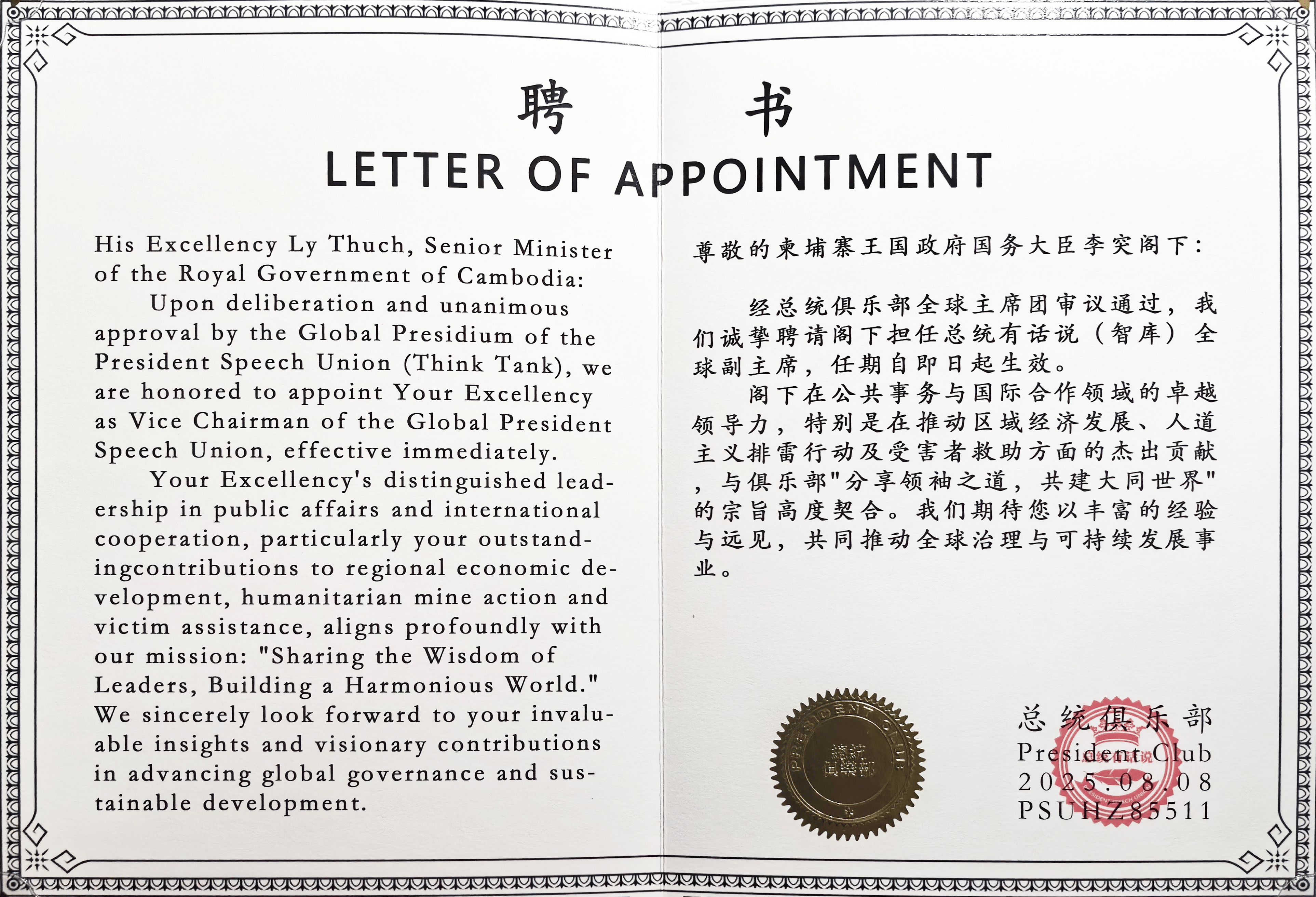 柬埔寨国务大臣李突受聘为总统有话说(智库)全球副主席