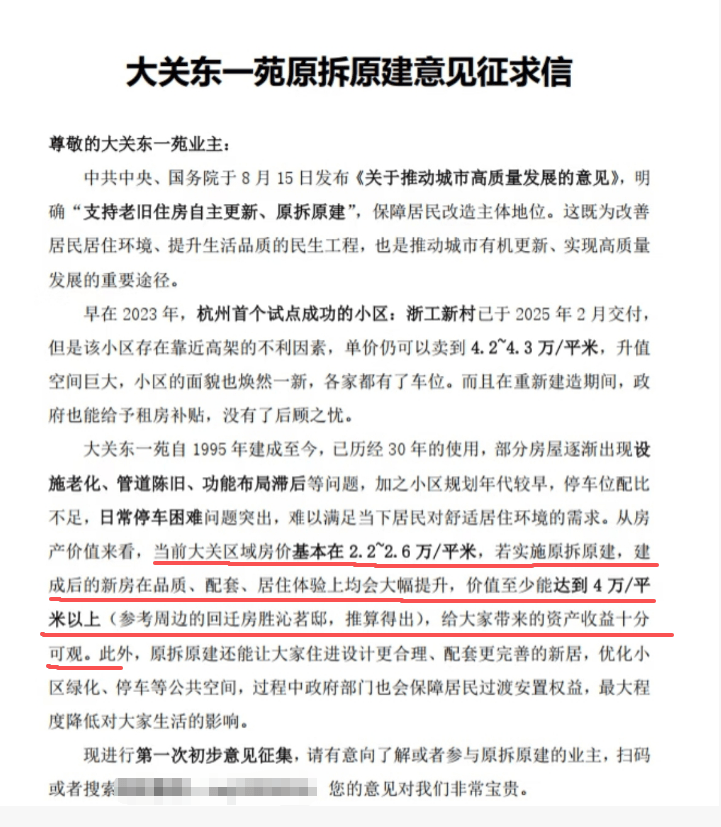 事件概述 - 杭州大关东一苑部分业主正在组织关于“原拆原建”的初步意见征集,旨在推动老旧小区更新 [1] - 该小区建于1995年前后,房龄约30年,面临功能布局滞后、停车困难等问题 [4] - “原拆原建”模式是在国家推动城市更新的政策背景下,由业主自愿、自主、自筹资金,通过社区自治推动的旧房改造方式 [4] 模式与政策背景 - “原拆原建”指在广泛征求业主意见基础上,自筹资金并引入开发单位,拆除原有老旧住房后,在原土地按原使用年限和建筑面积重建,业主最终原址回迁 [4] - 杭州自浙工新村成功实施“原拆原建”后,多个老旧小区有意跟进,但多数因意见统一难、资金自筹、执行复杂等问题而搁浅 [4] 成本与财务分析 - 参考浙工新村案例,原面积重建成本约为每平方米1350元人民币 [5] - 超出原产权面积(扩面)部分按市场价格计算,浙工新村案例中为每平方米34520元人民币 [5] - 原面积重建不扩面情况下,业主支出费用预计不到10万元人民币,加上装修补贴、临时租房补贴(每户每月不低于3000元人民币)等,几乎可覆盖原面积重置成本 [5] - 主要大额支出为扩面面积与车位费用,以浙工新村为例,扩面20平方米及一个车位总费用接近100万元人民币 [5] 潜在价值与市场预期 - 大关区域老小区当前二手房价格约为每平方米2.2万至2.6万元人民币 [5] - 业主预期“原拆原建”后新房品质将大幅提升,参照周边回迁房胜沁茗邸价格,估值可达每平方米4万元人民币,潜在房价涨幅或高达80% [5] - 浙工新村自2024年初交付后,二手房成交量有所上涨,均价稳定在每平方米4.1万至4.3万元人民币,显示改造后房产具有更高的市场流通性和溢价 [6] 执行挑战与前景 - “原拆原建”项目从启动到交付周期漫长,且面临业主意见统一难度大、老年人多、流动人口占比高、资金自筹压力等执行困难 [4] - 大关东一苑能否成功复制浙工新村模式仍有待观察,后续进展取决于业主共识形成与项目落地执行情况 [6]