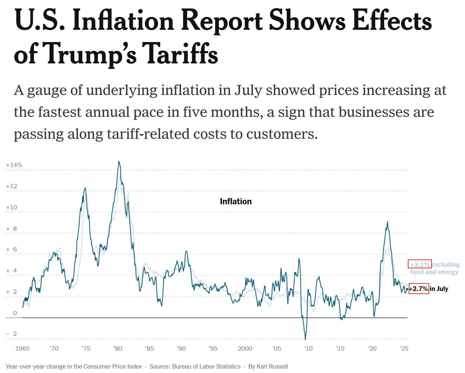 美国劳工部12日发布的最新报告显示,7月美国消费者价格指数(CPI)同比上涨2.7%,继续保持6月的涨幅;而剔除波动较大的食品和能源价格后,7月核 心CPI同比上涨3.1%,高于6月的2.9%。 在很多媒体和专家看来,自4月起连续反弹的通胀数据表明,美国政府的关税政策对物价的拉升效应正在越来越全面地显现出来。 △《纽约时报》报道截图 关税成本由谁"消化"? 继对多国加征钢铝和汽车关税以及10%的普遍基准关税后,美国政府最初于4月宣布并在随后几经延期的"对等关税"也于本月7日正式生效。 世界贸易组织(WTO)和国际货币基金组织(IMF)8日公布的数据显示,随着新关税的实施,美国对全球所有产品的贸易加权平均关税税率已达20.1%, 大幅高于年初本届美国政府上台前的2.4%,为110多年来的最高水平。 △新加坡亚洲新闻台报道截图 尽管美国政府一再声称加征关税是为了让那些"占美国便宜"的贸易伙伴买单,但种种分析数据都显示,实际税负已被逐渐转嫁至美国国内。 从供给侧看,美国国家零售联合会(NRF)日前发布报告预计,美国今年全年进口量将比去年下降5.6%。 NRF副总裁戈尔德警告称,受关税影响,未来美国市场上的商品种类将 ...