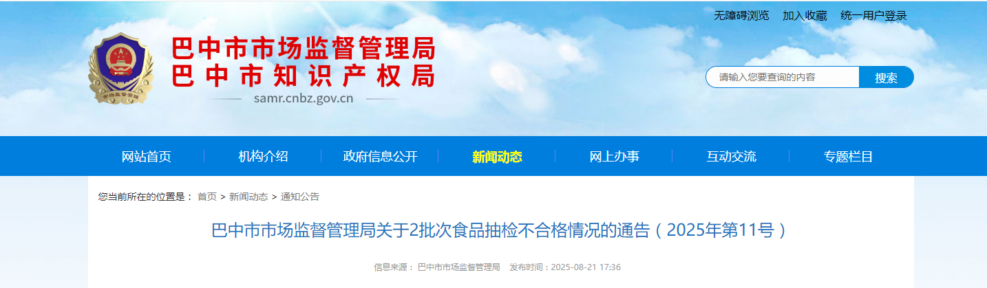 四川省巴中市市场监督管理局关于2批次食品抽检不合格情况的通告(2025年第11号)