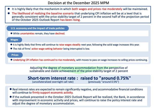 由此可见,近期日元的走软只是暂时的,日元未来大概率会重新走强,而日本股市也会迎来一波上涨行 情。 不过,日本资本市场的繁荣并不意味着日本经济的健康发展,笔者认为这反而会使得日本经济外强中干 的问题更加严重。 JerryZang 免责声明:本文内容及观点仅供参考,不构成任何投资建议。投资者据此操作,风险自担。一切有关市 场的准确信息,请以相关官方公告为准。市场有风险,投资需谨慎。 据媒体报道,12月19日日本央行在举行例行的货币政策会议后宣布,加息25个基点,将日本基准利率调 升至0.75%,这是近30年来的高点。 在会议后的记者招待会上,日本央行行长植田和男称,从整体通胀角度来看,日本经济已经处于通胀状 态。在被问及日本央行未来是否还会继续加息时,植田和男称,如果工资上涨继续向物价传导,加息确 实有可能。 近期,日元持续走软,日本经济的通货膨胀也不断攀升。在这样的背景下,日本央行做出加息的决定就 顺理成章。实际上,有些机构认为日本央行的加息举措滞后于市场。 正如笔者在先前文章中阐述的,日本央行的货币政策在相当程度上是在配合美联储的货币政策。当美联 储持续降息之时,日本央行却在不断加息,这实际上是在为有可能流出 ...