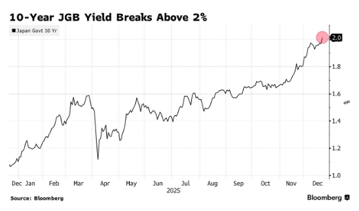 最新数据显示,日本11月全国CPI同比上涨2.9%,略低于前值;剔除生鲜食品的核心CPI维持在3%,剔 除生鲜食品与能源的核心指标从3.1%回落至3%。尽管通胀整体仍高于2%目标,但边际放缓使市场对激 进加息保持谨慎态度。同时,日本国债市场波动加剧。10年期国债收益率在加息后升破2%,创近三十 年高位。在公共债务占GDP比重接近250%的背景下,收益率上行增加了市场对财政可持续性的担忧, 也限制了对日元资产的风险偏好。 UNFX 12月19日讯 日本央行完成加息操作后,日元并未出现预期的反弹。周五亚洲至欧洲交易时段, 美元/日元在波动中回升,重新接近156.00水平。尽管政策利率上调25个基点至0.75%,创近三十年来新 高,但行长植田和男在会后新闻发布会上的偏温和表态,令市场对后续紧缩节奏的预期降温,日元随之 再次承压。盘面显示,加息公布后,日元短线虽有所波动,但很快转弱,这表明市场已提前消化了此次 政策调整,汇率定价的焦点重新集中在"未来是否继续收紧"这一核心问题上。 海外方面,美国11月CPI与核心CPI均低于预期,强化了通胀降温信号,市场对美联储降息的预期持续 升温,利率期货显示2026年累计降息幅度 ...