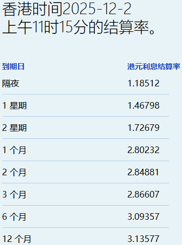 港元拆息市场动态 - 12月2日,港元拆息全线向下,与楼按相关的一个月拆息报2.80232%,下跌13.256基点,且已连跌三日[1] - 反映银行资金成本的三个月拆息报2.86607%,下跌7.5基点[1] - 隔夜拆息报1.18512%,下跌0.464基点[1] 各期限拆息具体表现 - 短期拆息中,一周拆息报1.46798%,下跌15.571基点,两周拆息报1.72679%,下跌15.059基点[1] - 中长期拆息方面,六个月拆息报3.09357%,下跌9.81基点,一年期拆息报3.13577%,下跌9.971基点[1] - 根据结算率表,两个月拆息为2.84881%[2]