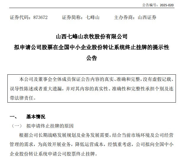 公司终止挂牌决策 - 2025年12月1日,山西新三板公司七峰山发布公告,拟申请股票终止挂牌,为其新三板生涯按下暂停键 [1][14] - 公司董事会已于2025年11月27日审议通过终止挂牌议案,该议案尚需提交2025年第一次临时股东会会议审议 [3][17] - 终止挂牌原因系结合长期战略规划、市场环境及经营需求,为高效开展业务、降低运营成本作出的慎重决定 [4][18] - 公司承诺对异议股东实施权益保护措施,未投赞成票的股东可在终止挂牌后1个月内提出书面回购申请 [4][18] 公司基本情况与历史沿革 - 公司前身为太原市阳曲县七峰山种养殖有限公司,于2022年3月挂牌新三板,主营业务是羊驼养殖销售及羊驼免疫实验 [3][16] - 截至2025年6月末,公司总资产为7208万元 [3][16] - 公司实控人为邓榆生、邓昕父女,邓榆生持股65%并任董事长,邓昕持股35%并任董事、总经理 [5][19] - 创始人邓昕于2014年从澳洲学成归国后,瞄准羊驼养殖赛道开启创业 [5][19] 行业风口下的快速扩张 - 公司借助羊驼因综艺和网络梗图爆火的“风口”快速扩张,与山西农业大学合作,从国外引进100只种羊驼创办养殖基地 [6][20] - 截至2022年2月,公司羊驼养殖规模已近1400只,每年繁育小羊驼最高可达1000只左右,累计销往全国20多个省市地区 [6][20] - 公司探索羊驼毛、皮、乳、血等副产品销售及生物医药研发服务,毛利率长期维持在60%以上 [8][22] - 2019年至2021年1-7月,小羊驼平均销售单价分别为1.8万元/头、1.98万元/头、2.46万元/头,价格逐期上升 [8][22] 资本运作与高光时刻 - 2021年12月24日,公司在山西证券督导下进入新三板基础层,当年羊驼业务占比92.3%,毛利率58.7%,归母净利润313.85万元 [8][22] - 2022年6月,公司完成挂牌后首次定增,以2.00元/股的价格发行6000万股,募集资金1.2亿元,总股本增至8000万股,投后市净率1.25倍 [8][22] - 凭借亮眼表现,公司一度入选山西省重点上市后备层企业名单 [8][22] 业绩变脸与经营恶化 - 受疫情影响,羊驼进口渠道受阻,且“网红效应”消退导致行业消费疲软 [8][22] - 2024年,公司实现营收1214.26万元,同比下降16.75%;归属净利润亏损200.15万元,为挂牌以来首次年度亏损 [9][23] - 2024年存货周转天数从2023年的595.60天延长至633.87天,资金占用加剧,经营效率下滑 [9][23] - 2025年上半年,公司营收仅505.48万元,同比下降39.60%;归属净利润亏损45.43万元,同比由盈转亏,降幅达126.68% [11][25] 监管问题与市场挑战 - 2024年5月9日,山西证监局向公司出具警示函,指出其2022年两笔合计2000万元的关联交易未履行董事会审议程序及信息披露义务 [11][25] - 公司解释2025年上半年业绩恶化主要归因于宠物市场整体低迷,个人客户减少,销售单价降低,以及智利低价宠物羊驼进口冲击市场、竞争加剧 [11][25]