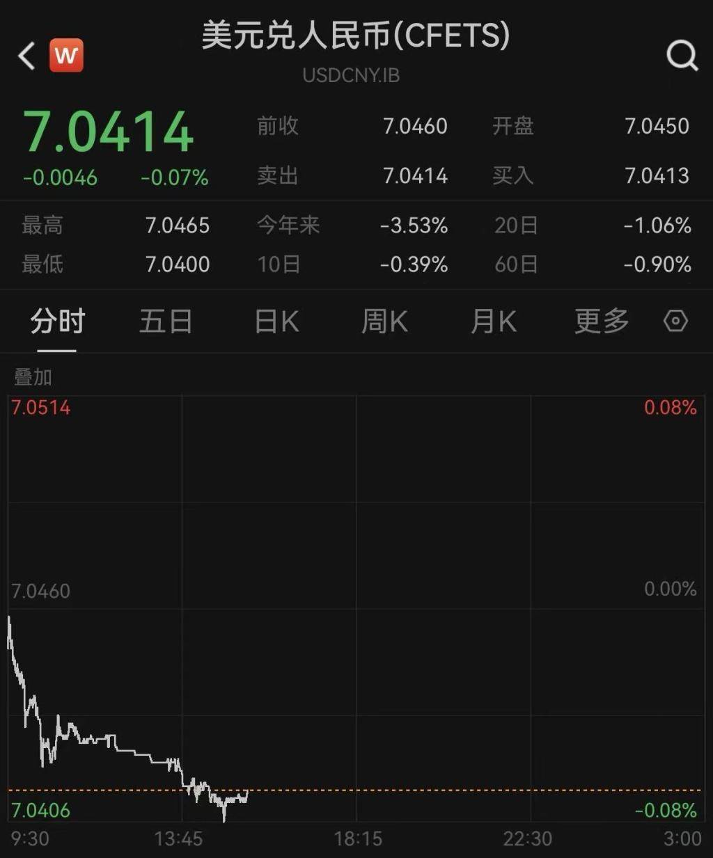 人民币对美元即期汇率升至7.04,创14个多月新高