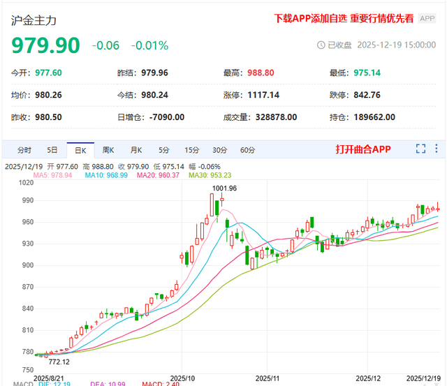 古尔斯比与另一位地区联储主席投反对票,主张维持利率稳定,而理事米兰支持更大幅度降息。古尔斯 比上周五声明称,应等待更多通胀数据再决定是否进一步降息,新年处理此问题风险不大,且可获取最 新经济数据。他周四再次强调,在确信通胀回归目标前,不宜前置性降息,需看到降低价格压力的进 展。 今日周五(12月19日)亚盘时段,沪金主力合约今日亚盘高位窄幅震荡,价格走势略滞后于国际金价, 整体交投于977-980元/克区间。 打开APP,查看更多高清行情>> 【要闻速递】 芝加哥联储主席古尔斯比周四对最新CPI数据表示欢迎,认为若趋势持续,将为明年进一步降息创造条 件。他强调,利率终值将远低于当前水平,只要通胀能重回2%目标轨道,明年底大幅降息是现实的。 尽管11月CPI显示价格压力缓和,但古尔斯比提醒勿过度解读单月数据。这份因政府停摆延迟的报告引 发经济学家谨慎态度,其有利变化未被视为物价压力可持续减弱的明确信号。美联储12月10日降息25个 基点至3.5%-3.75%,旨在平衡就业市场风险与高通胀。 【最新黄金期货行情解析】 沪金价格持续运行于主要移动平均线之上,整体多头趋势格局未变。但已连续多个交易日收出上影线, 显示 ...